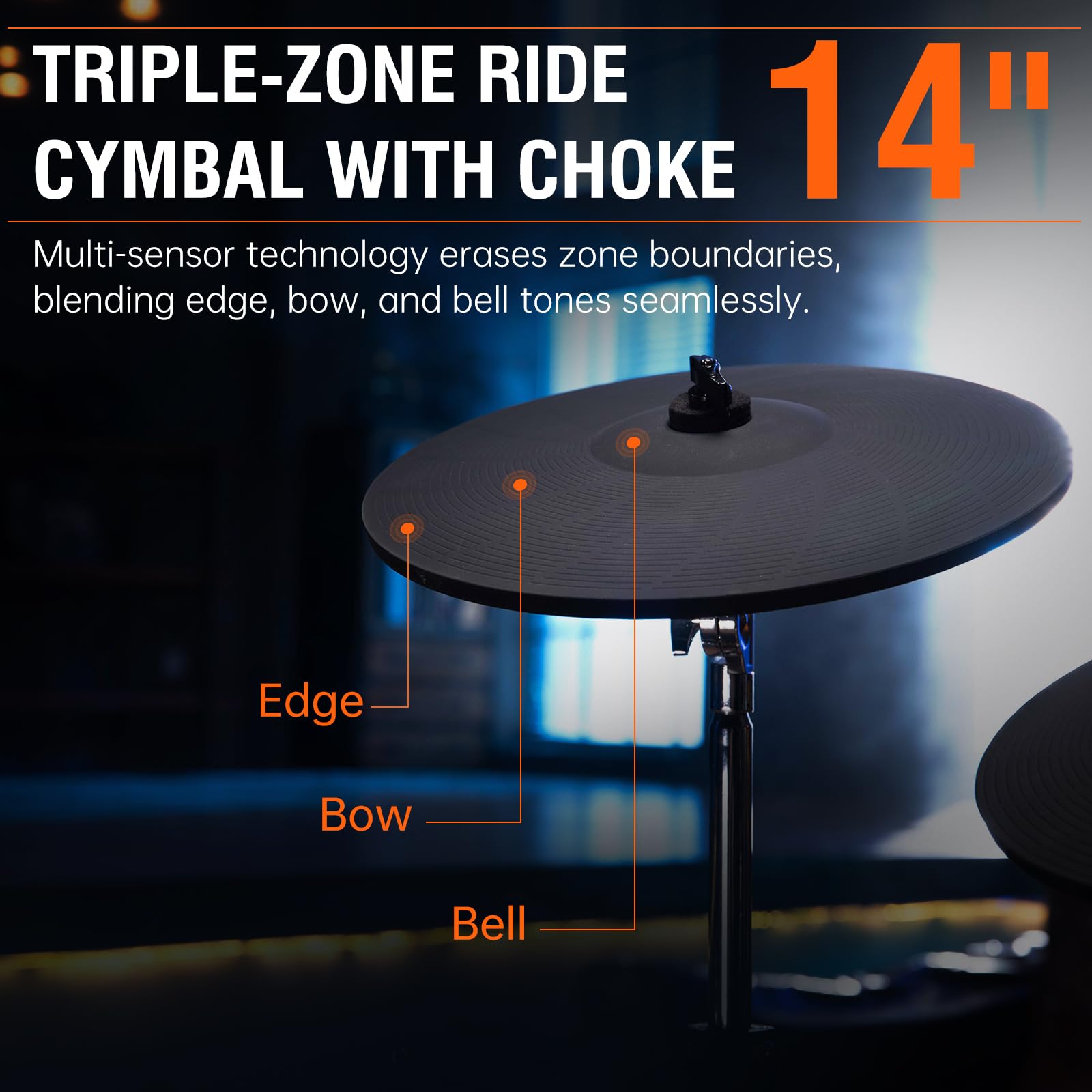 All Silicone Cymbal Collection with Pro Response: Crafted from high-density silicone compound, these professional cymbals deliver unmatched acoustic realism across every strike. The Dual-Zone Crash features precision bow/edge detection with instant choke response, while the 14'' Triple-Zone Ride (edge/bow/bell) provides seamless transitions from defined bell attacks to complex wash tones. Both cymbals boast specially textured playing surfaces that deliver 85-90% energy return for natural stick rebound, with advanced multi-sensor technology maintaining phase-accurate signal integrity.