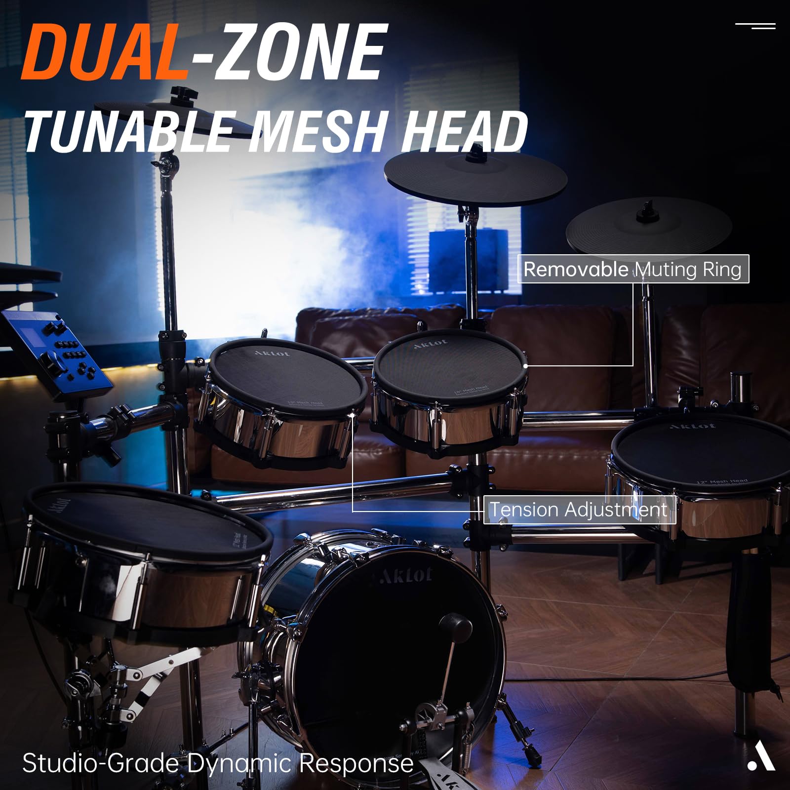 Triple-Ply Mesh Tom Drums with Acoustic Response: All drum pads feature triple-layer mesh heads that deliver acoustic-like rebound and response, with dual-zone triggering for accurate head and rim detection. The tension-adjustable design allows customized feel from tight to loose settings, while removable muting rings enable instant switching between full resonance (for live play) and 80% noise-reduced mode (for silent practice).