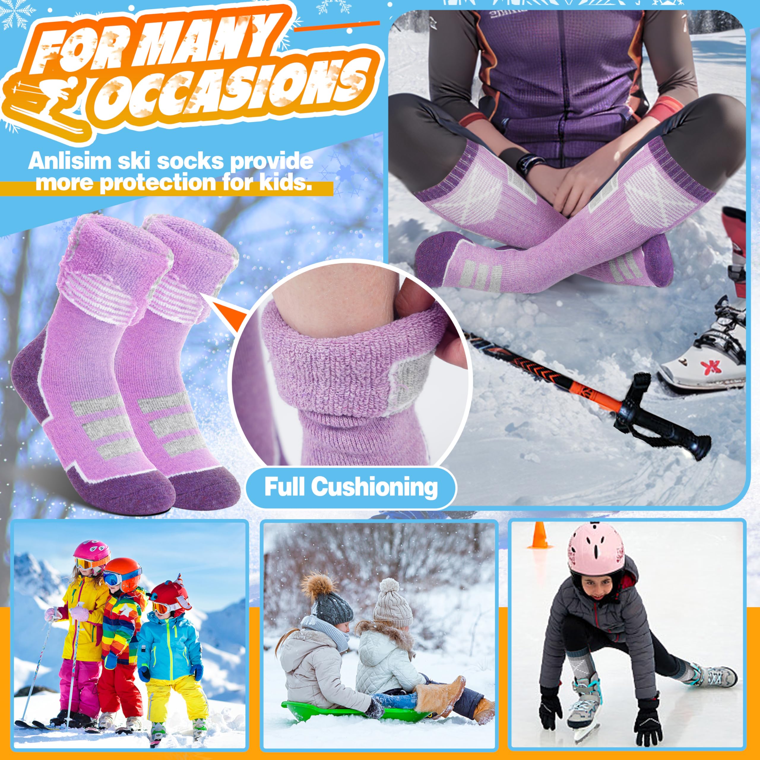 COMPOSITION - Anlisim kids skiing warm socks are made of 70% Merino Wool, 23% Polyester, 5% Spandex , 2% Nylon,which have better moisture control function and keep child’s feet fresh all the day.They are perfect for active boys, girls or teenagers!