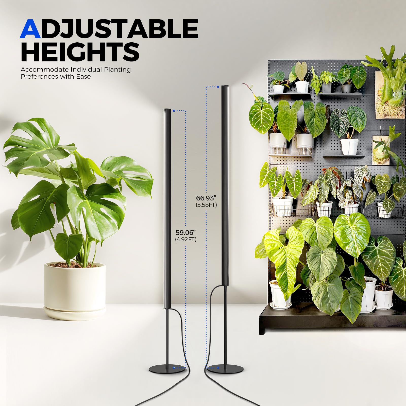 Full Spectrum & Adjustable Height: Equipped with full-spectrum lighting, the Barrins T1S grow lights support all plant growth stages—from seedlings to flowering. Its adjustable height ranges from 5FT to 5.6FT, allowing you to precisely position the light to match plant height and lighting needs, ideal for tall potted plants like monstera and fiddle-leaf fig