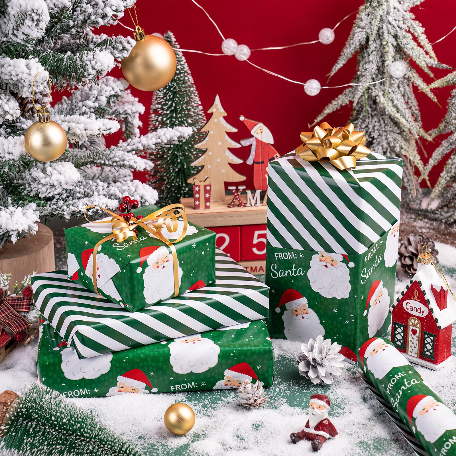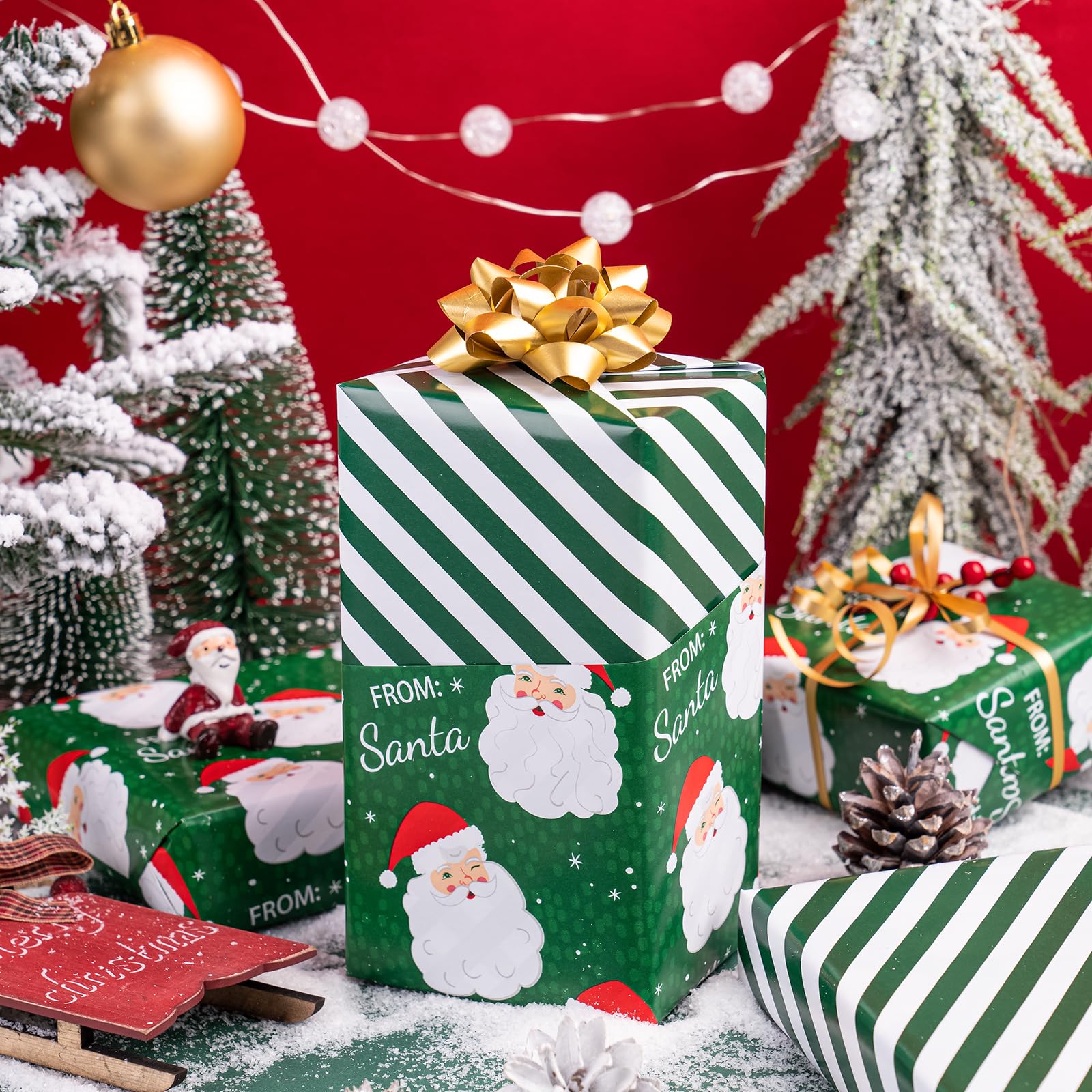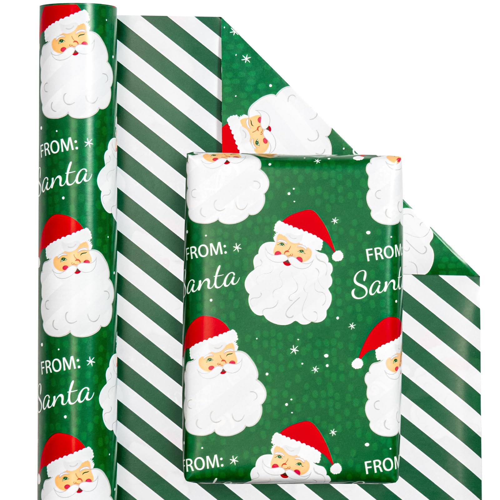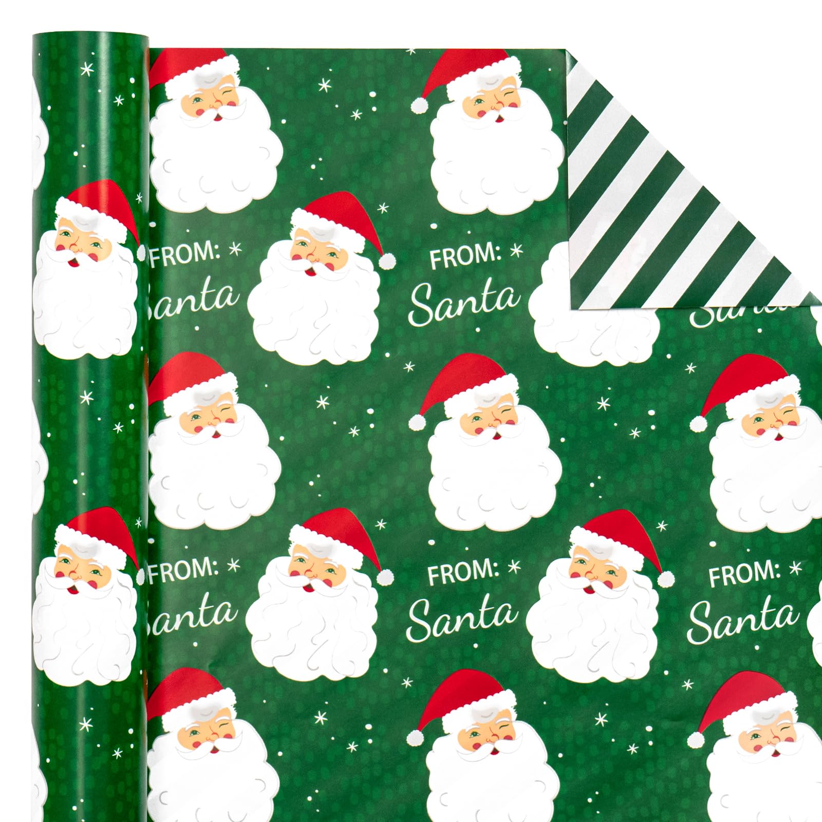 Reversible Design: Green Santa Claus with "From Santa" lettering printed on one side, green and white stripe printed on the reverse. Two different designs make unique and varied gift presentations easy.