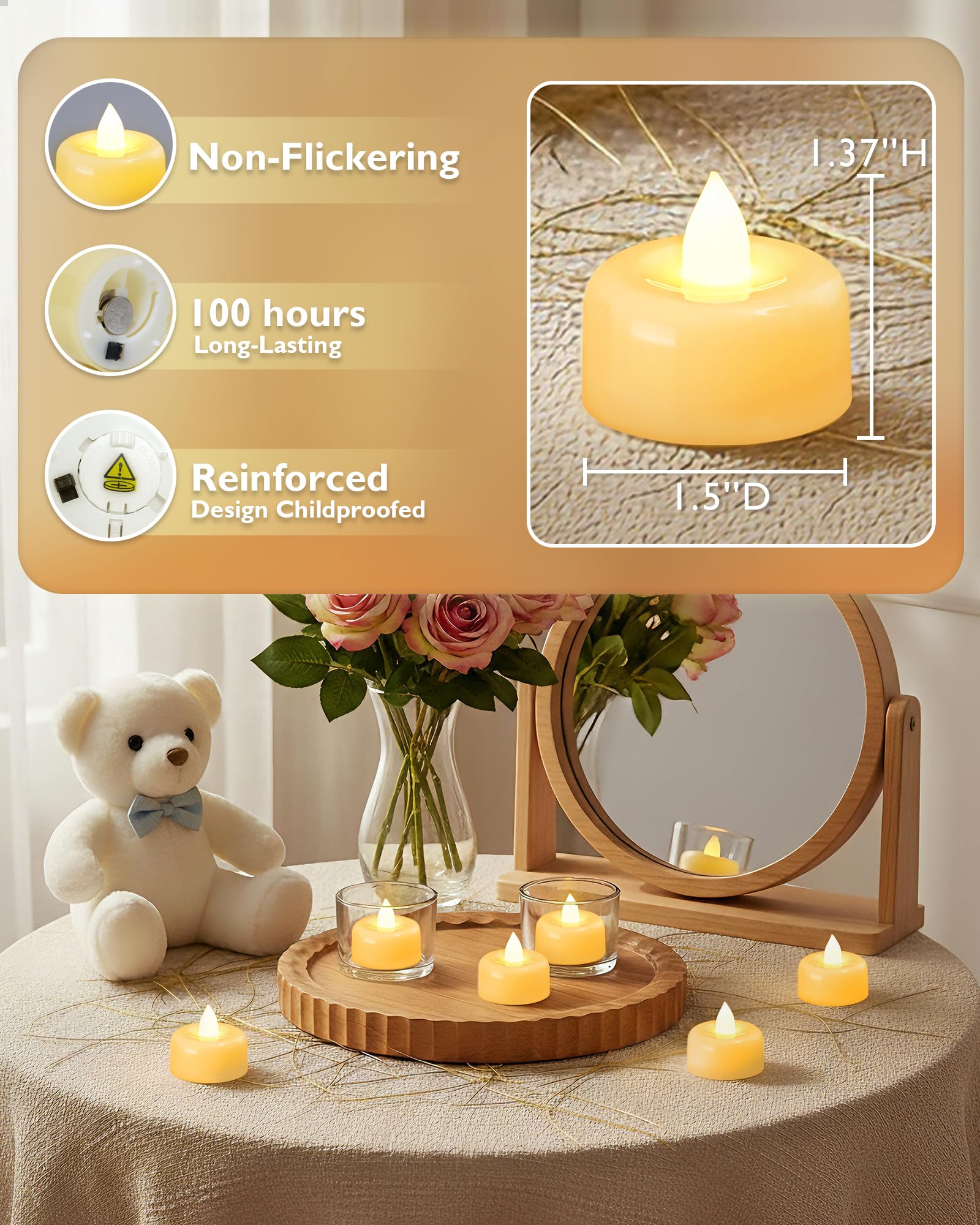 100PACK SET: 1.5"W x 1.37"H battery tea lights candles(Battery pre-installed) can be the perfect replacement for traditional candles used at home, avoiding the fire hazards of traditional candles, do not worry about candles being blown out by the wind