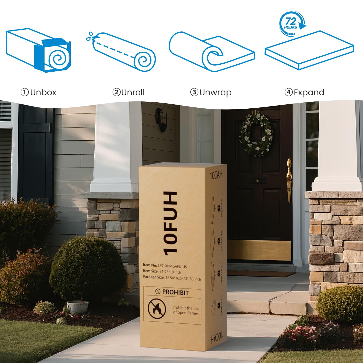 【10 inch Full Size Mattress in a Box】This full bed mattress comes compressed and conveniently shipped to your doorstep. Simply unbox and unfold the mattress—no complicated installation required. After removing the mattress from its plastic packaging, Please allow 48-72 hours for it to recover and for any potential odors to dissipate. Mattress expansion time will vary depending on the surrounding environment, any memory foam expands faster in a warm room; in cold temperatures, your mattress may take longer to return to its normal size from its compressed state.