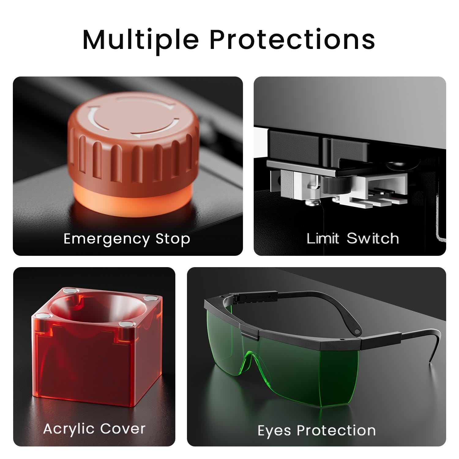 3. Safety-First Design: Work with confidence thanks to the included protective glasses that help reduce eye exposure. The emergency stop button adds extra peace of mind, giving you full control in any situation.