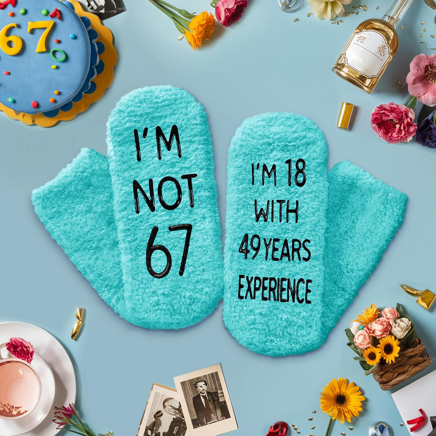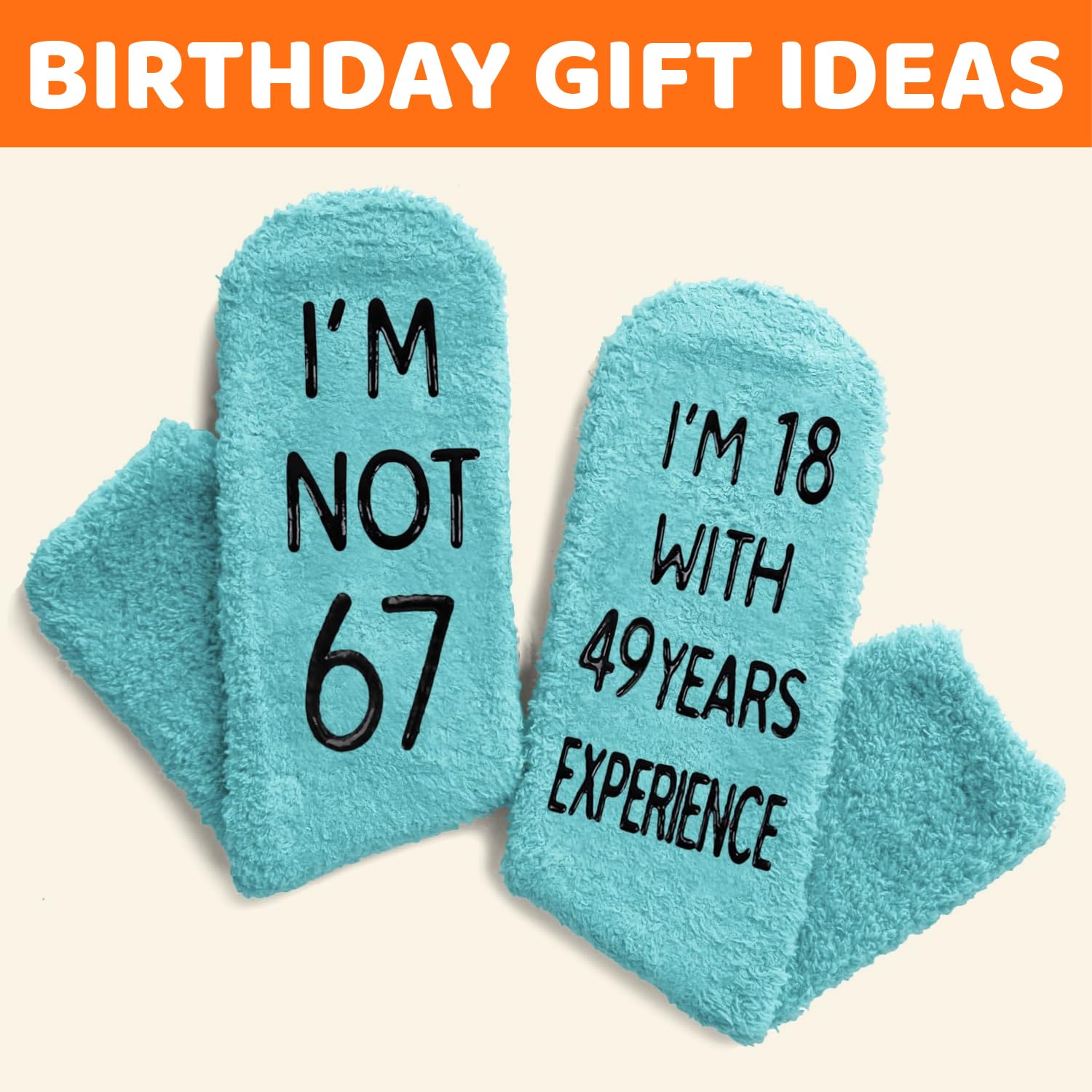 67th BIRTHDAY GIFT IDEAS: Celebrate birthday with our unique socks, humorously inscribed with "I'M NOT 67, I'M 18 WITH 49 YEARS EXPERIENCE."They make an ideal gift for Birthdays, Christmas, or White Elephant exchange.