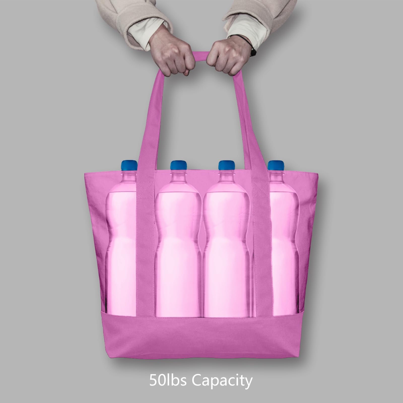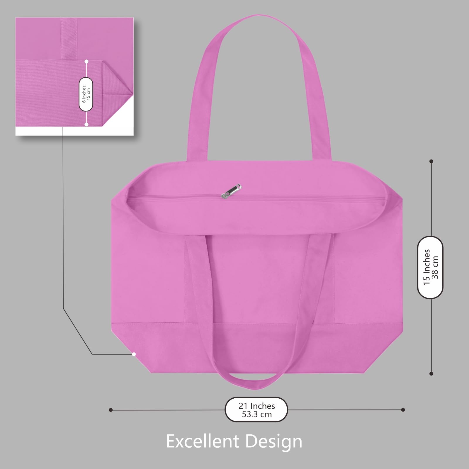 LARGE CAPACITY & DURABILITY: the size is 21" x 15" x 6" and it is made of heavy duty 100% 12oz cotton canvas with 8" x 8" outside pocket for carrying small items. Further, the top zipper closure makes your goods safer. Its handle is 1.5" W x 25" L, which is easy to carry or slung over a shoulder. The bags are made with dense thread and exquisite workmanship. All seams are reinforced and sewn to ensure their durability.