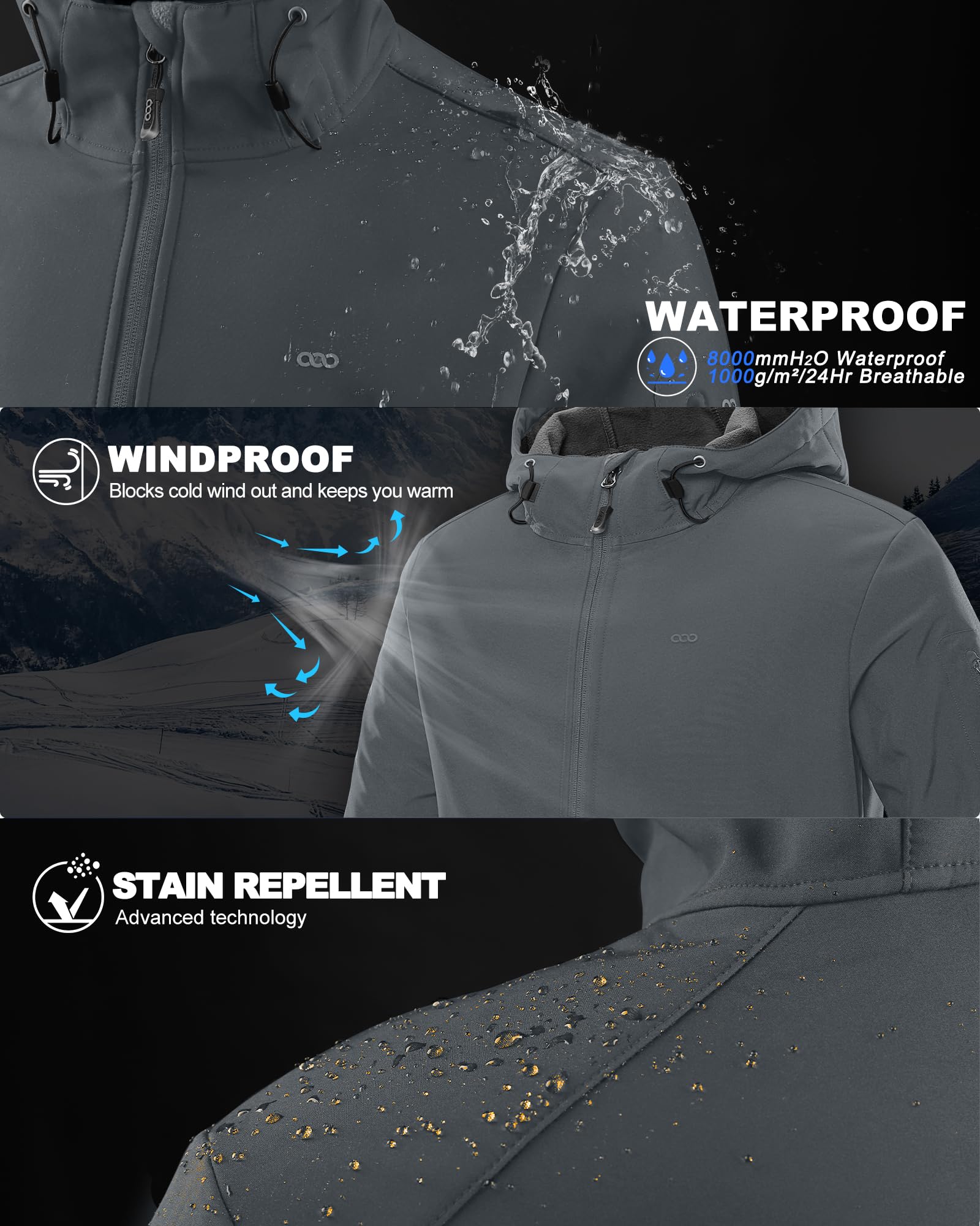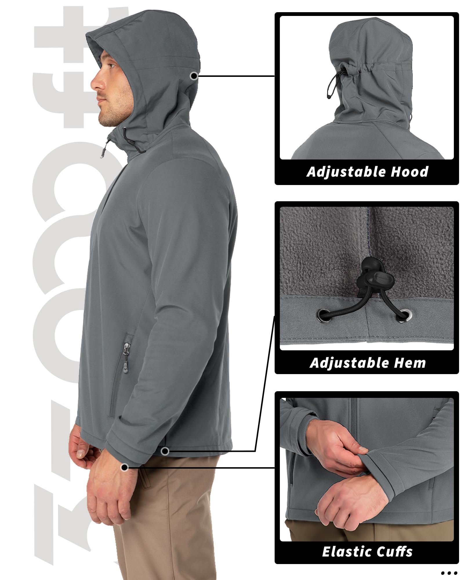 【WATERPROOF & BREATHABLE】33,000ft men's softshell jacket with hood features 3-layered material with outer soft shell, TPU membrane mid-layer and inner fleece lining to provide strong protection against the elements. Outer shell with DWR finish resists water, dirt and oil to keep you dry and clean. (8000MM fabric waterproofness rating, 1000G/M2/24hr fabric breathability rating)