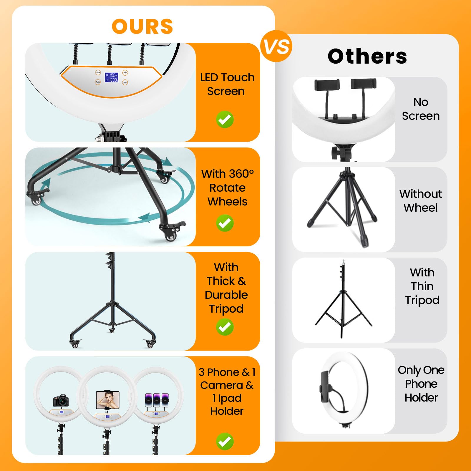 ✅ 【Omnidirectional Casters & Practical Tray】▶️Equipped with three high-quality metal caster wheels, the big ring light with stand can be easily moved and adjusted to optimize the distance. The casters feature a locked mechanism to ensure the stand remains securely in place,prevent any unintended movement during use.Match with stable tray holder, you can switch the height you need by adjusting the screw tightness, it's great for holding small accessories like capos, harmonics, cell phones and so on.
