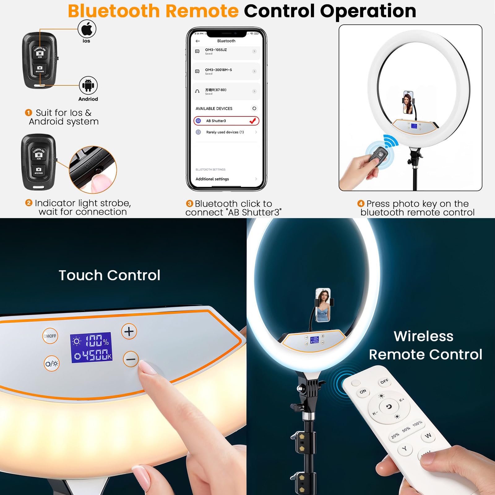 ✅ 【Two Optional Control Ways】▶️ Two optional ways to adjust our 18 inch ring light. One is manual touch control that you can easily rapid switch lighting color mode in nearby. Another is remote control for far distance (About 10meter) and it is convenient access to brightness, color temperature and scene lighting settings. This will ensure you to have the best pictures and videos with the most suitable distance and brightness.