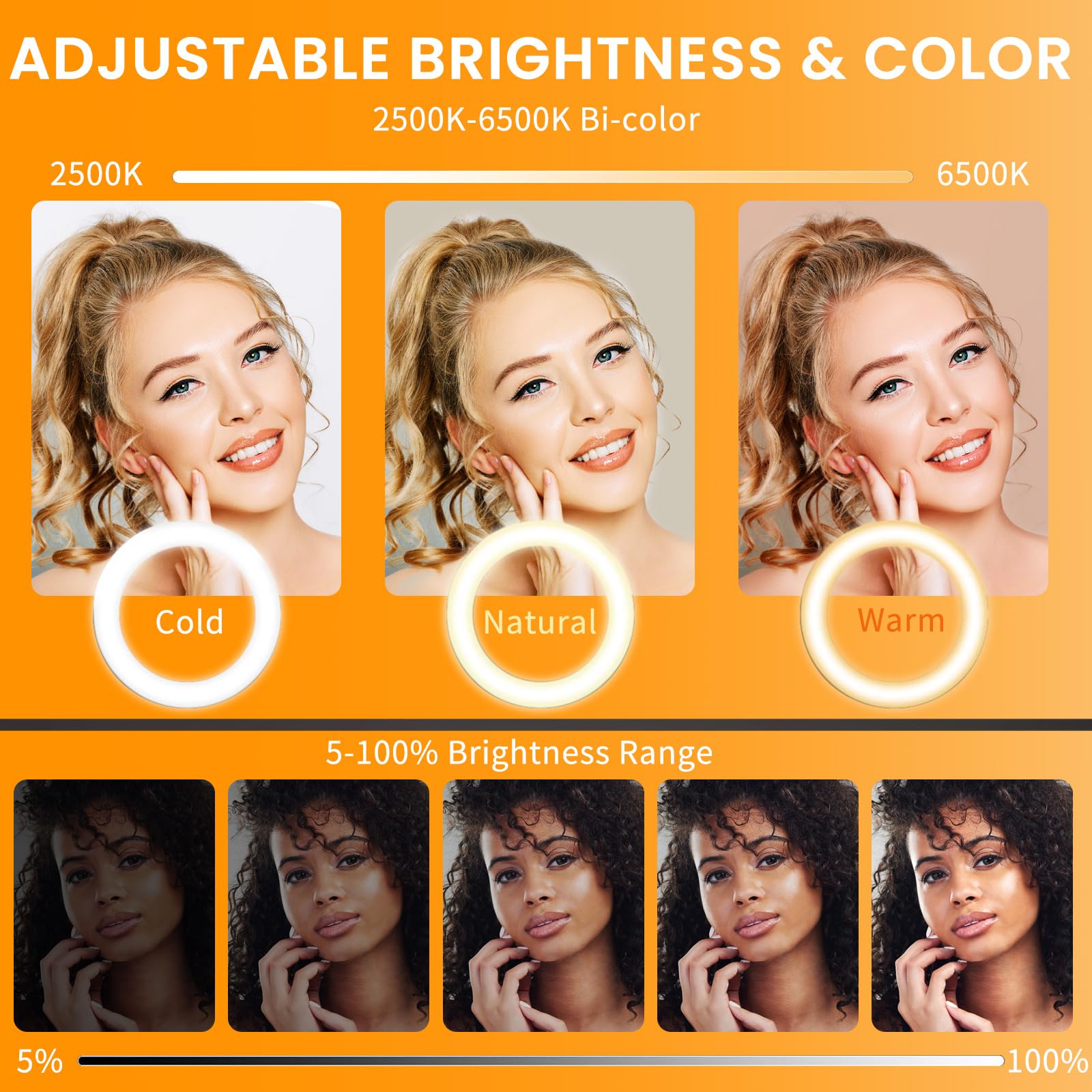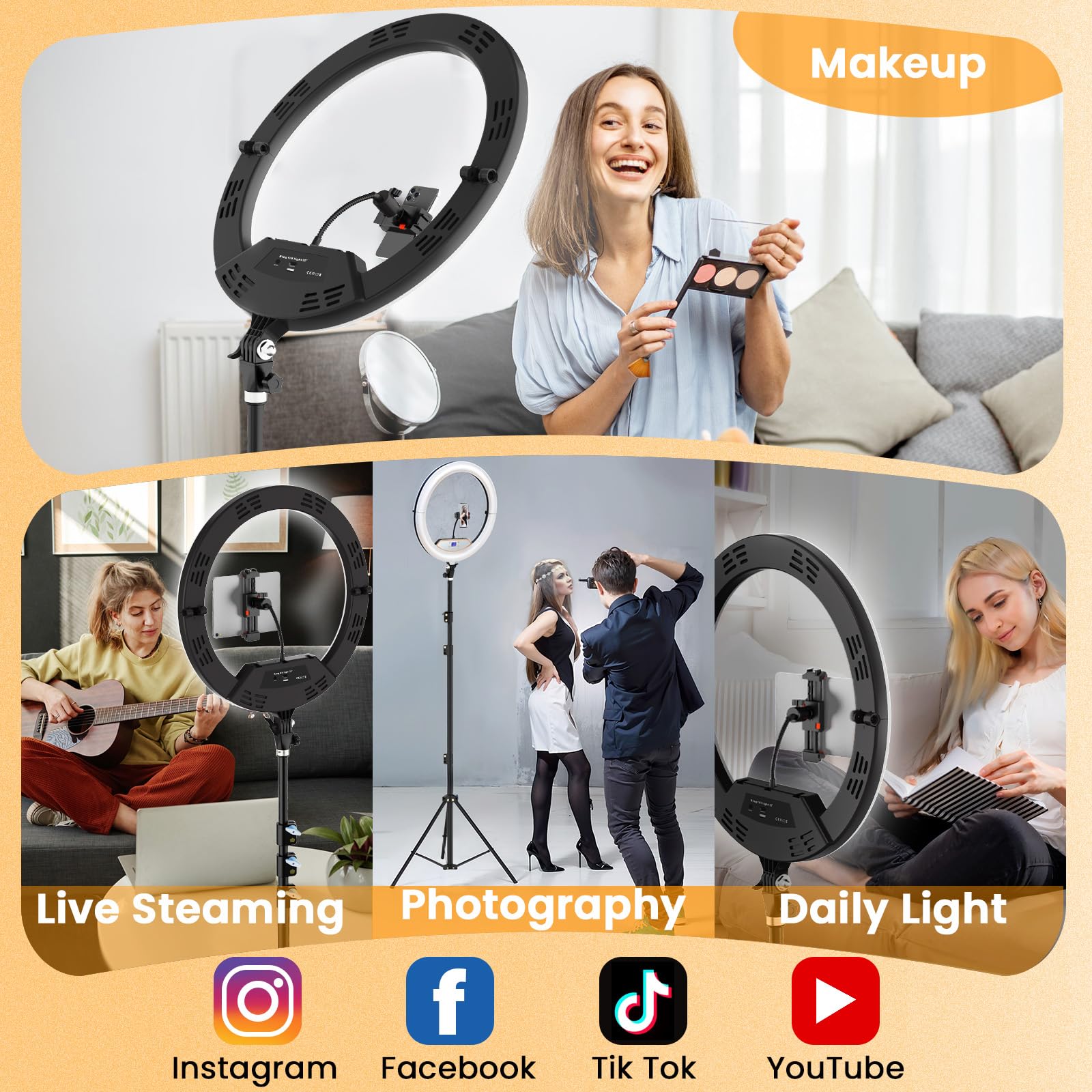 ✅ 【Bi-colors Mode Professional Ringlight with Tripod】▶️ For brightness, large ring light with stand can be adjusted from 5% to 100% to suit the need of surroundings. Light spectrum modes can change between warm white (3500K), balanced white (4500K), cool white (6500K) at the flip of a switch, the best color requirement can be adjusted according to different scenes.For the stability of 18 inch ring light for ipad, we equipped a 75 inch tripod with maximum load bearing of 18lbs[8kg].