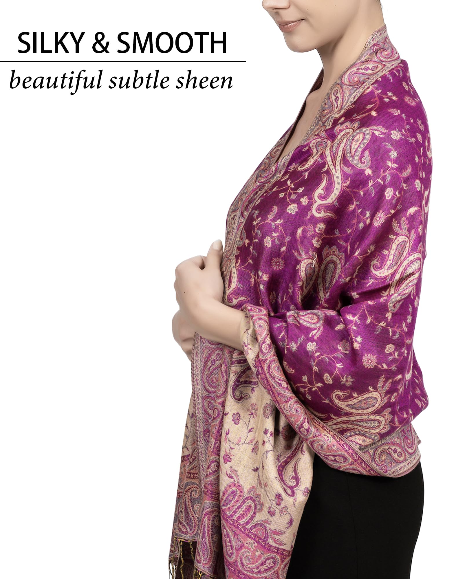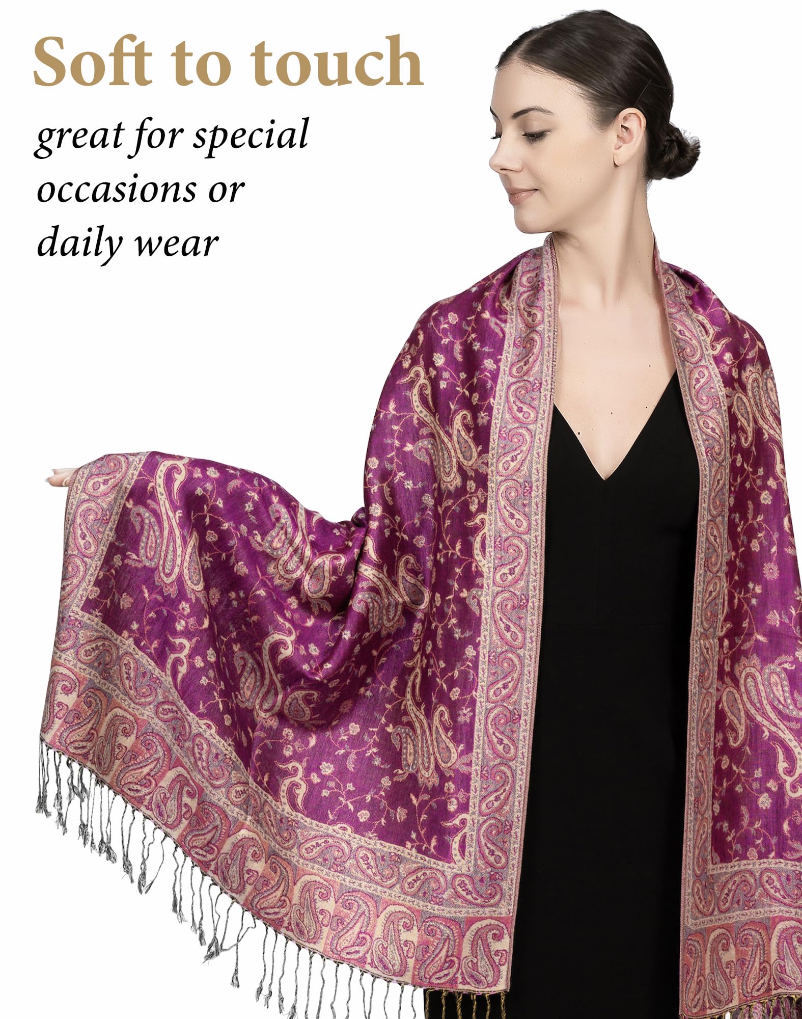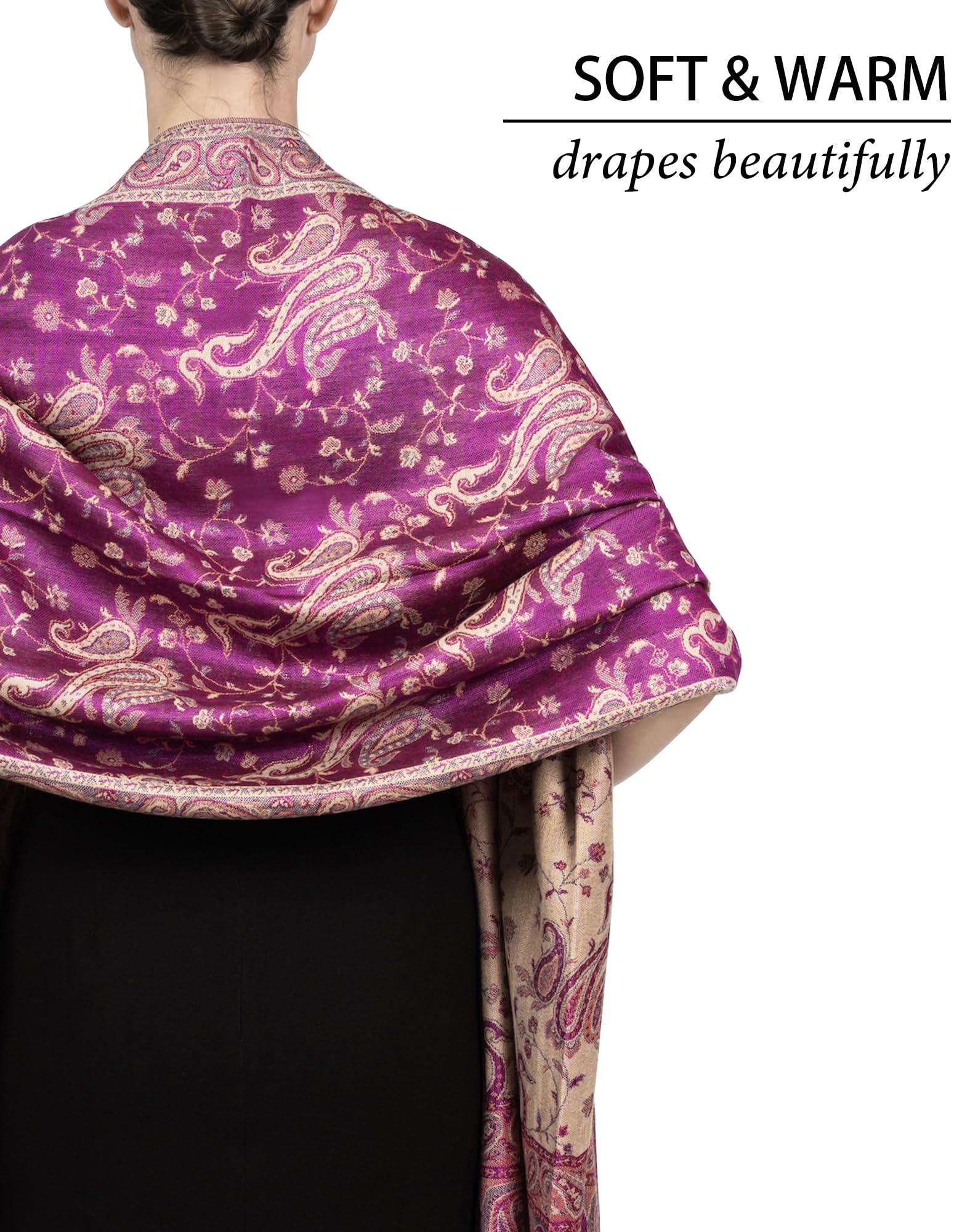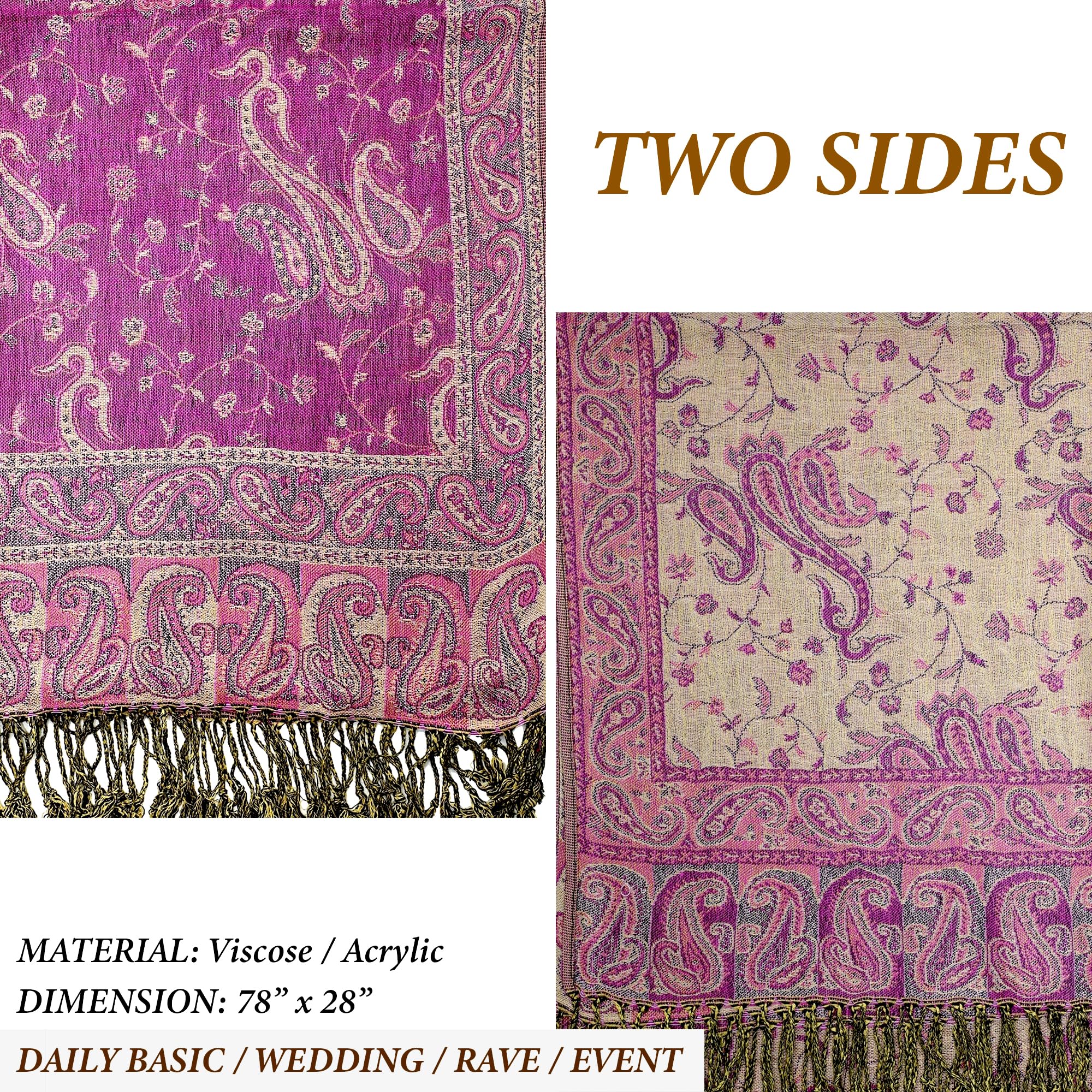 ✔️ Exotic Tapestry Look with Reversible Design – This reversible paisley shawl wrap for women features two beautiful color tones in one piece. It complements everything from evening gowns to rave outfits for men and women, offering vibrant style with graceful comfort.