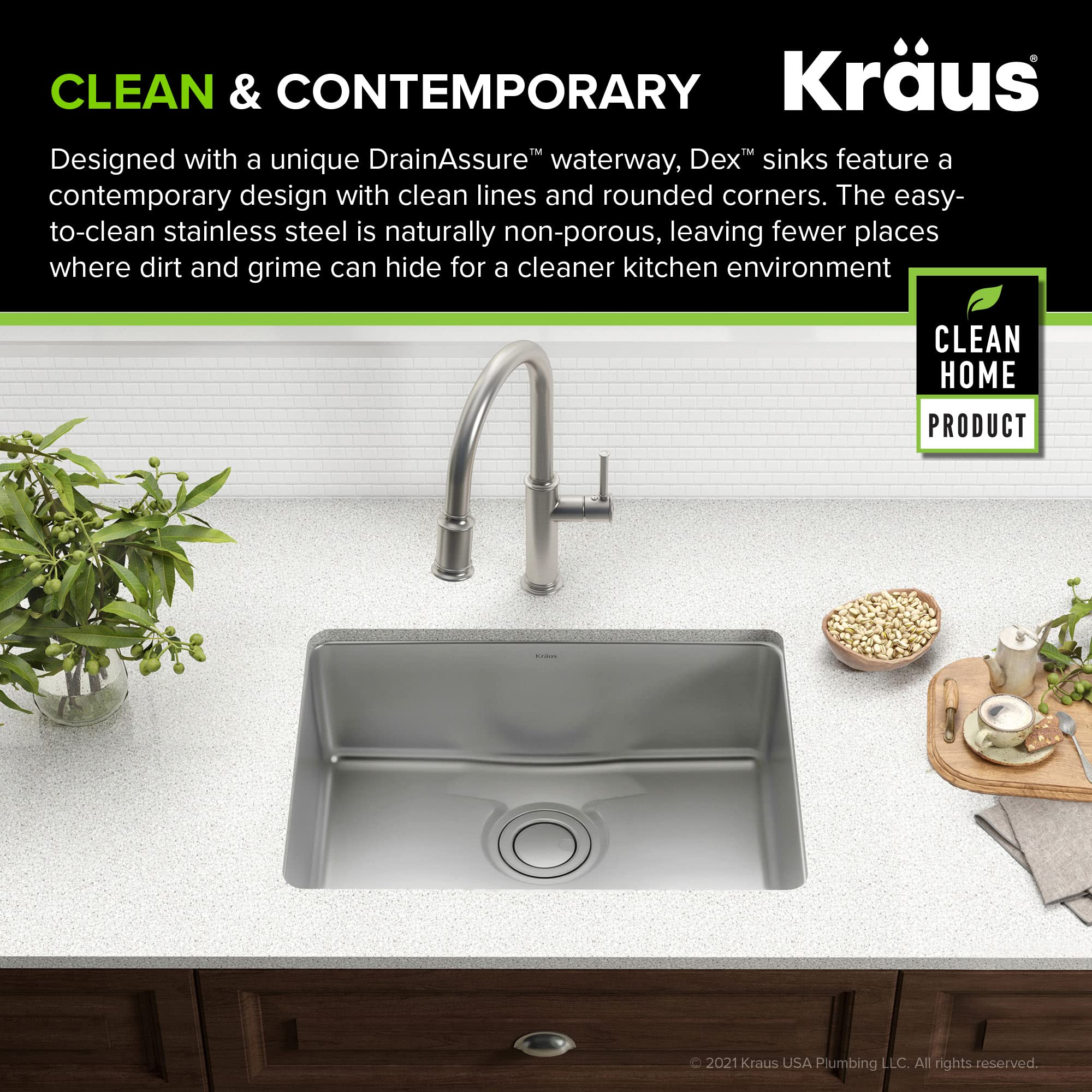 KRAUS EXCLUSIVE DrainAssure WATERWAY: Ground-breaking waterway engineered to channel water directly into the drain, even with dishes in the sink, helping prevent standing water at the bottom of the bowl