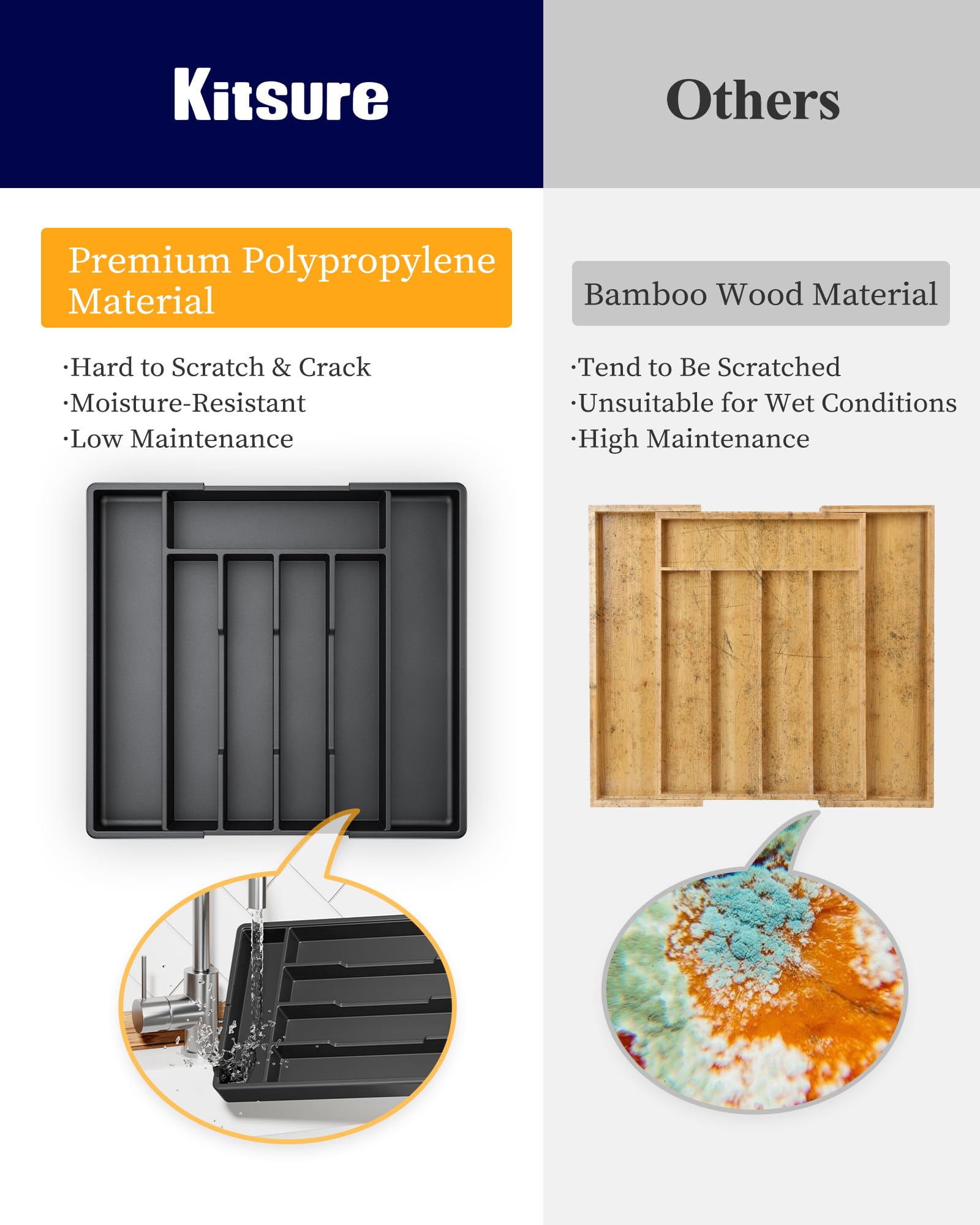 EXPANDABLE FOR CUSTOMIZABLE FIT: No more messy cutlery drawers! The Kitsure flatware organizer for drawers features an expandable width from 8.1" to 13.2", making it a perfect fit for most kitchen drawers. Whether you have a compact space or a larger storage area, this adjustable utensil holder ensures an organized and clutter-free setup.