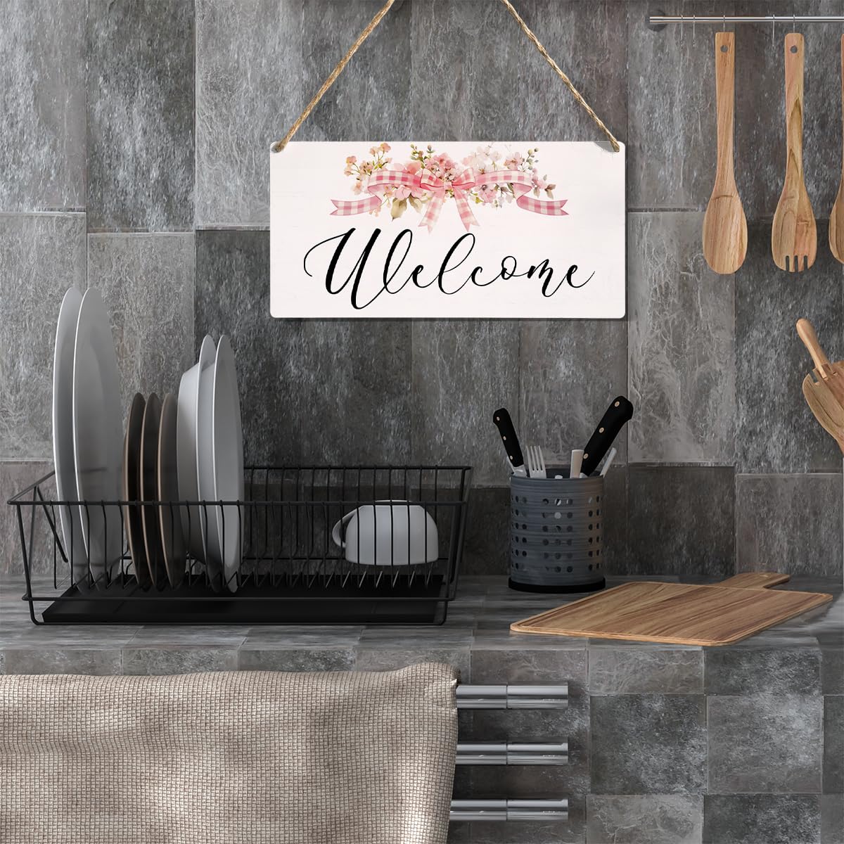 Easy Hanging: Installation is extremely easy. There are two reserved holes and a free rope of each sign that easy to be hung on any wall surface, etc. It can also be put atop a table, desk or counter to spruce it up