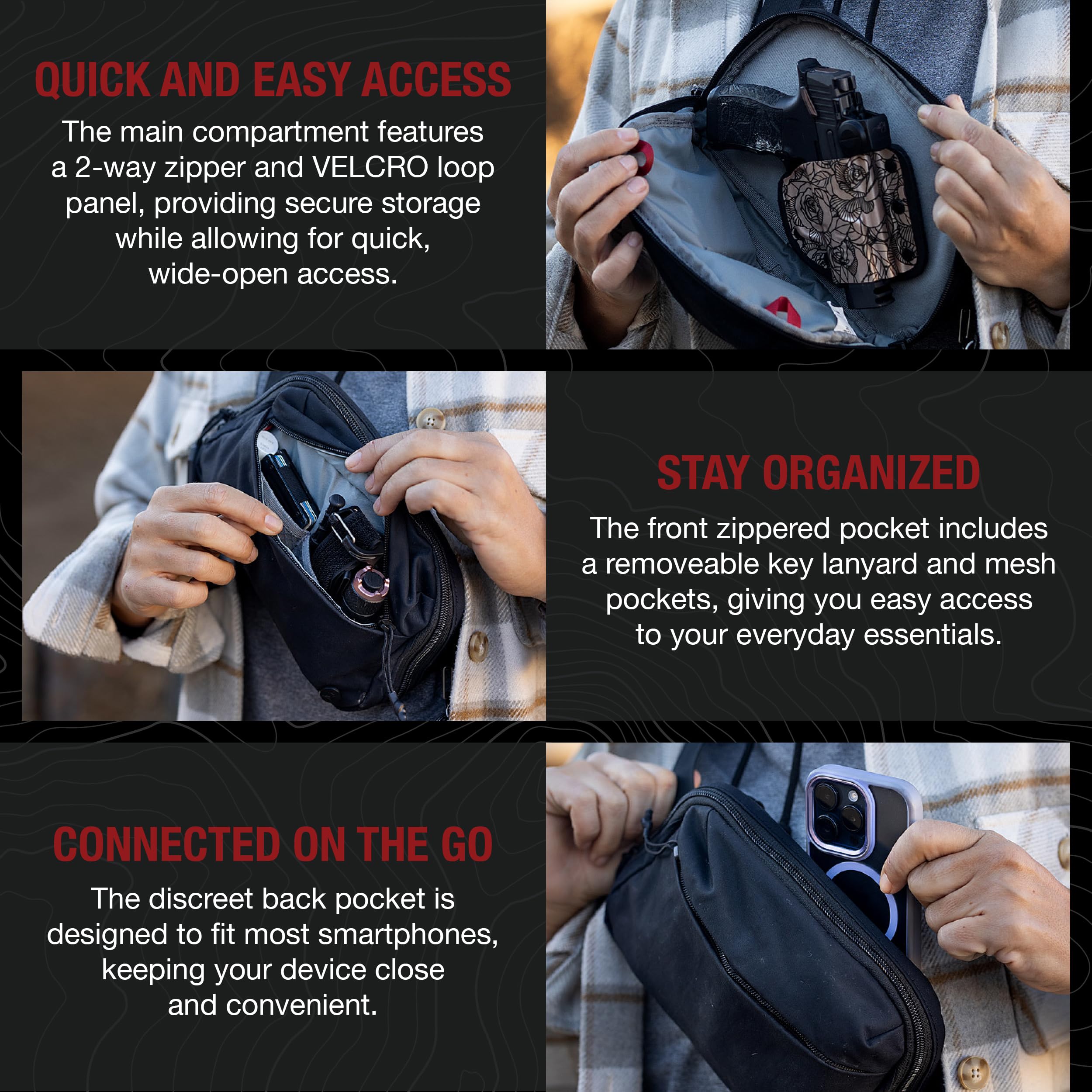 FAST, RELIABLE ACCESS - The Rapid Access Tab and Modular Holster Retention System ensure instant readiness, giving this CCW fanny pack the speed and control needed when every second counts.