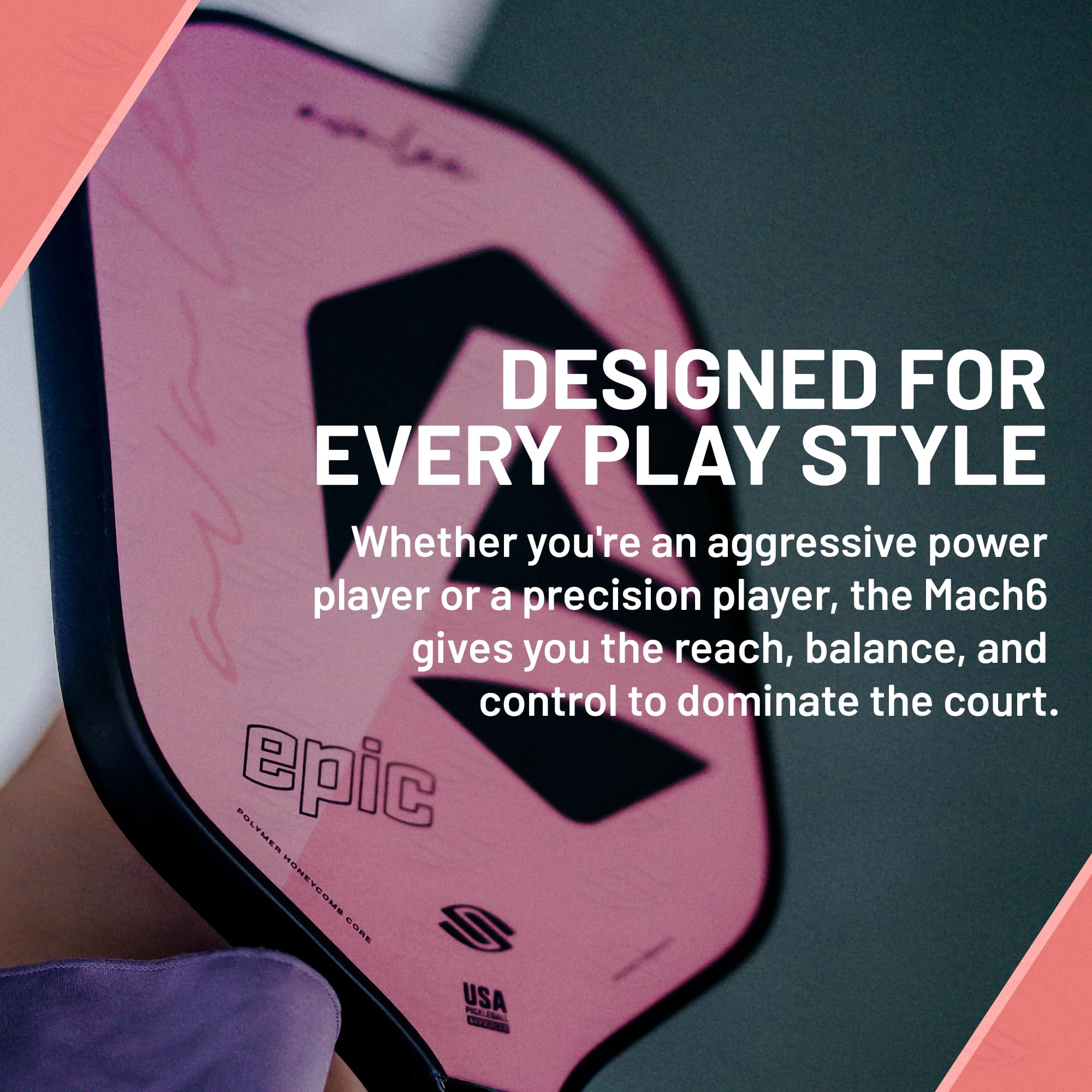 MACH 6: With an elongated surface area integrated with our longest handle yet, the Mach6 allows you to dominate the court with a two-handed backhand. Tennis players will love the Mach6 reach and sweet spot.