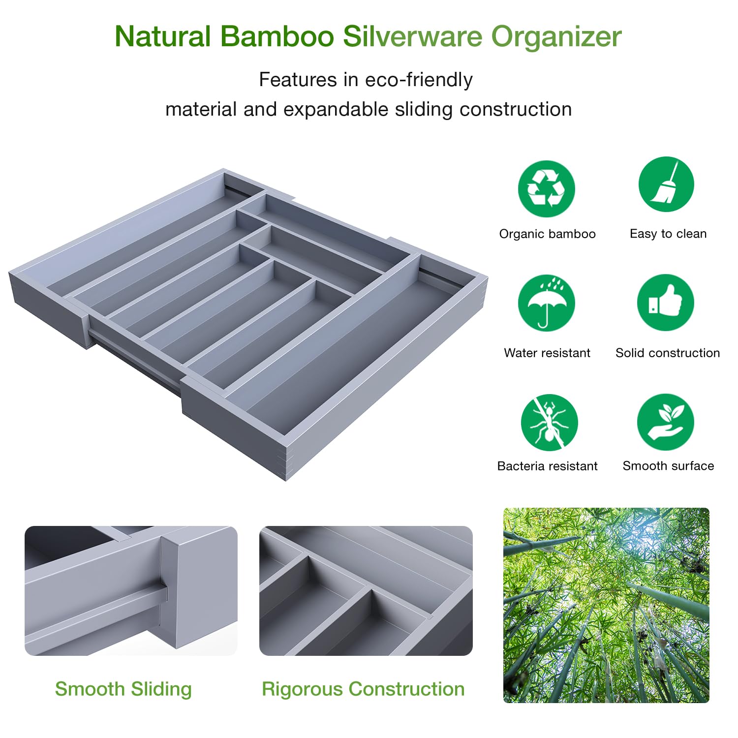 Expandable and Adjustable Utensil Organizer: Designed with 6-8 compartments, the silverware organizer can save space while accommodating multiple items, which is expandable from 12.91 inches to 19.69 inches wide with smooth sliding.