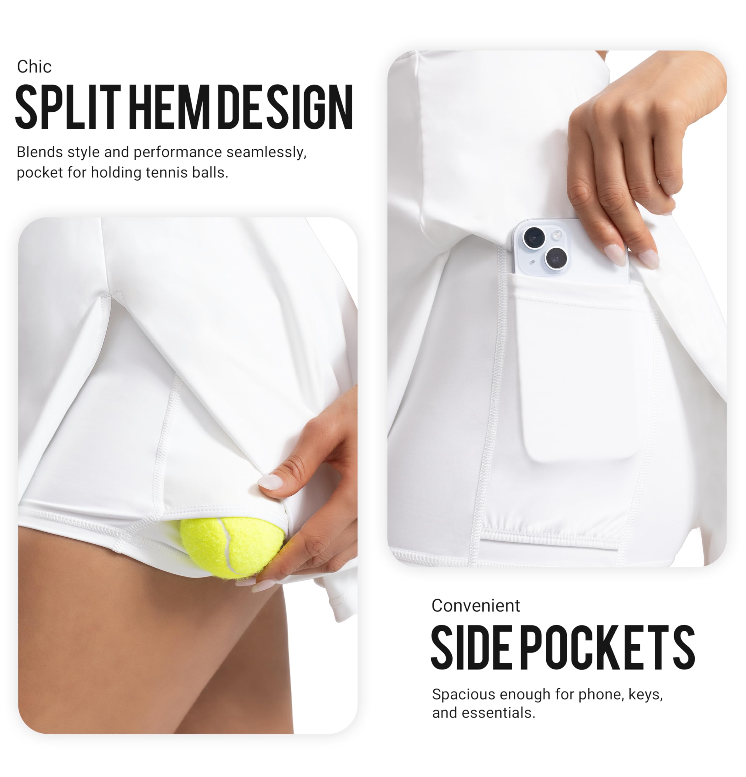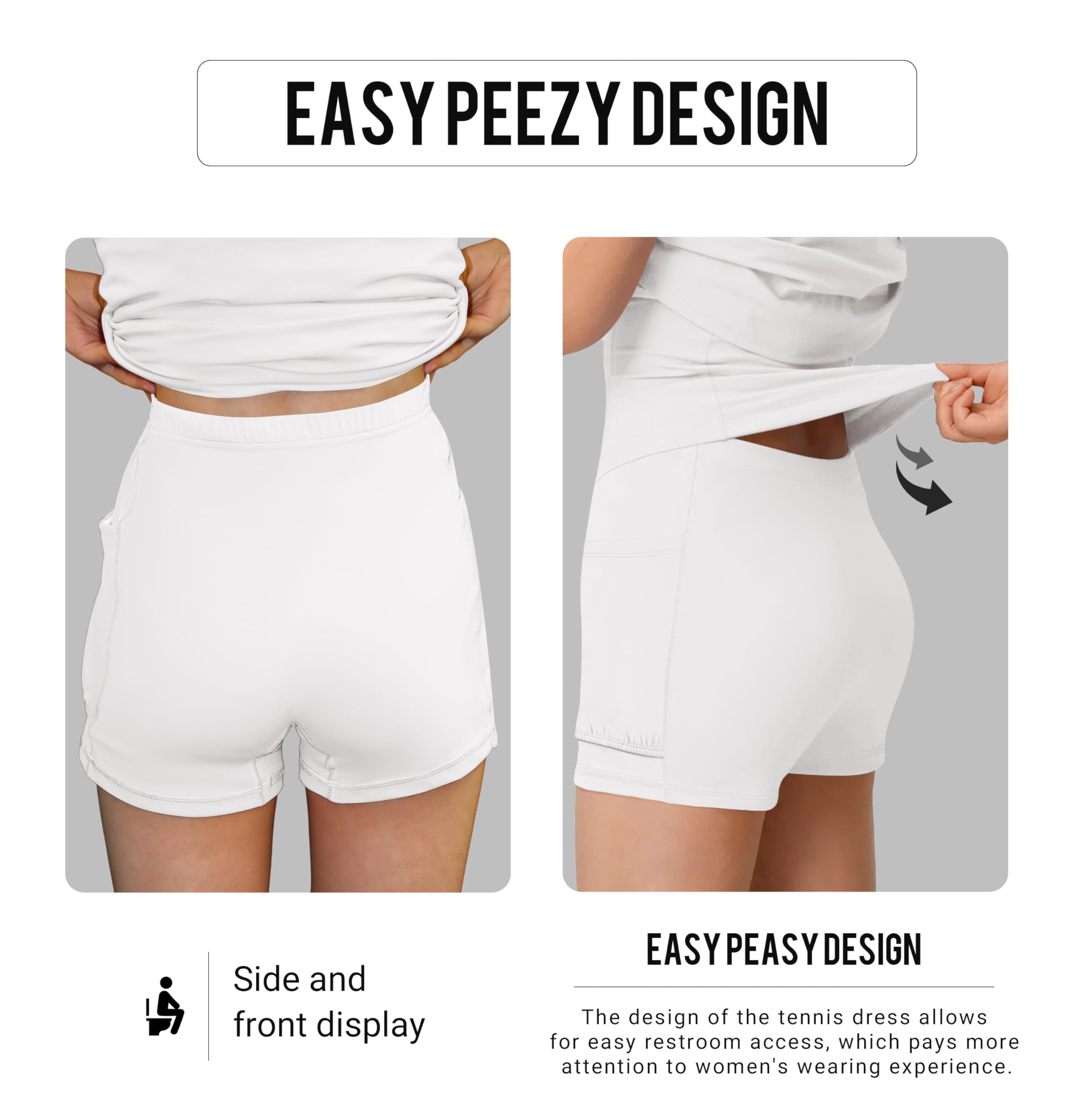 Built-in Shorts with Pockets:Stay confident and focused with the built-in shorts that provide coverage and support during intense matches. The shorts are designed to stay in place, giving you peace of mind as you move. Plus, they come with convenient pockets to store small essentials like tennis balls or keys, keeping your hands free for the game.