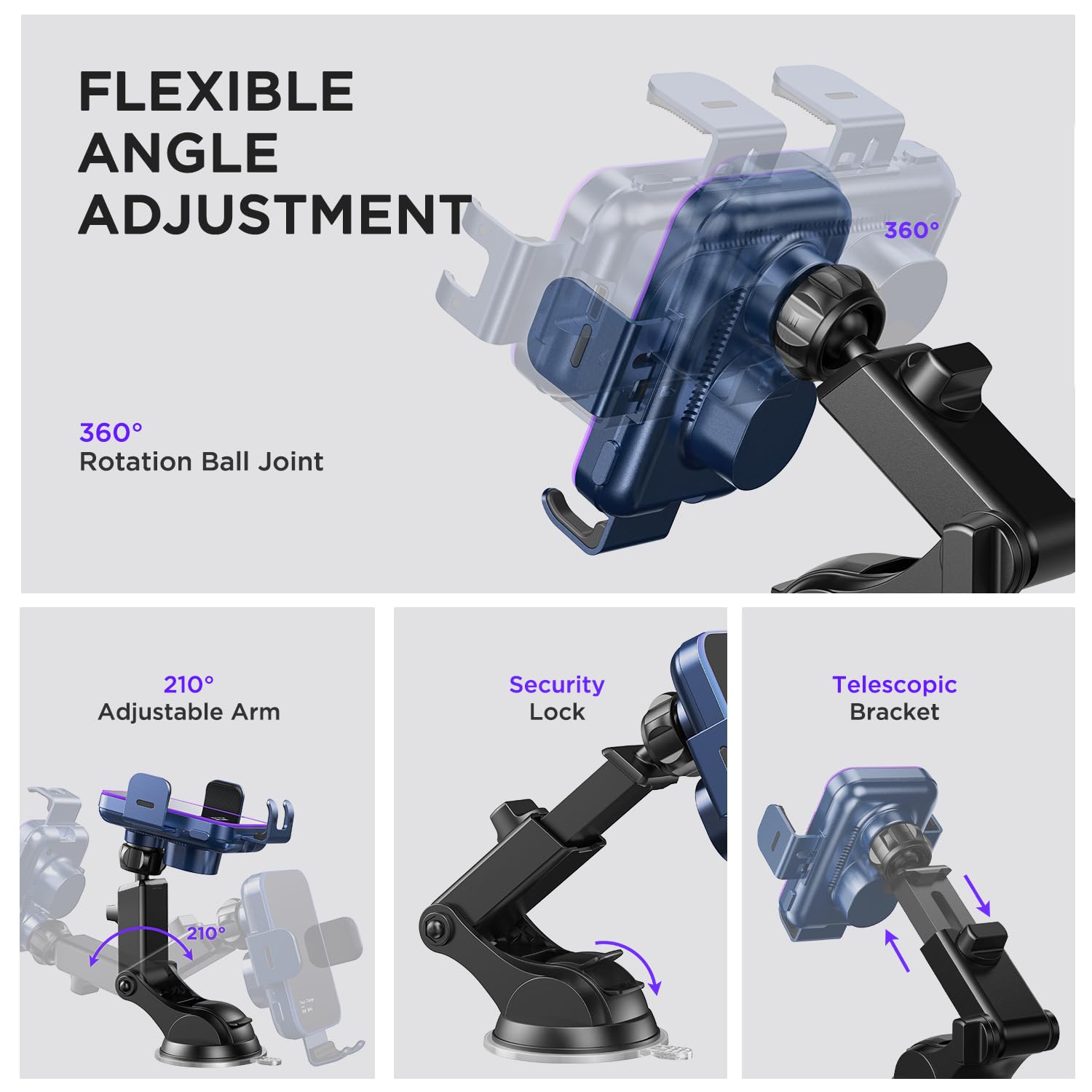 FLEXIBLE ANGLE ADJUSTMENT: 360° ball joint and extendable telescopic arm allow to custom the phone to any angle. This phone mount for car let you use the phone in portrait and landscape mode, which enjoys a safer and more relaxed driving experience