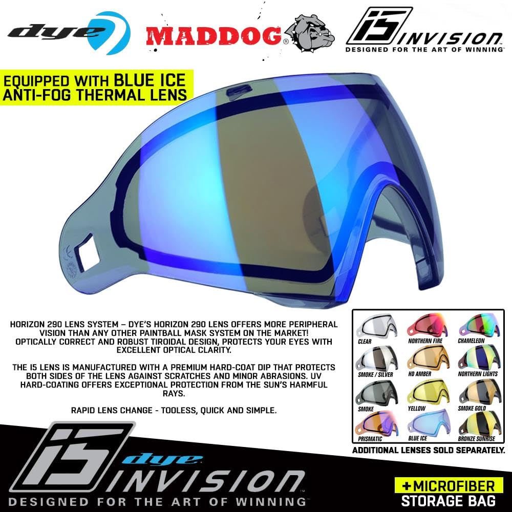 Maddog Dye Mask Combo for the Win! The DYE PRECISION i5 Anti-Fog Thermal Paintball and Airsoft Goggle is engineered to perform and inspire, representing the pinnacle of mask development. This aggressive, ultralight mask offers superior protection, enhanced venting, exceptional comfort, improved sound processing, and top-tier safety. Worn by the best in paintball! Maddog Combo Package includes a Maddog Microfiber Storage Bag to keep your mask protected and scratch-free between games.