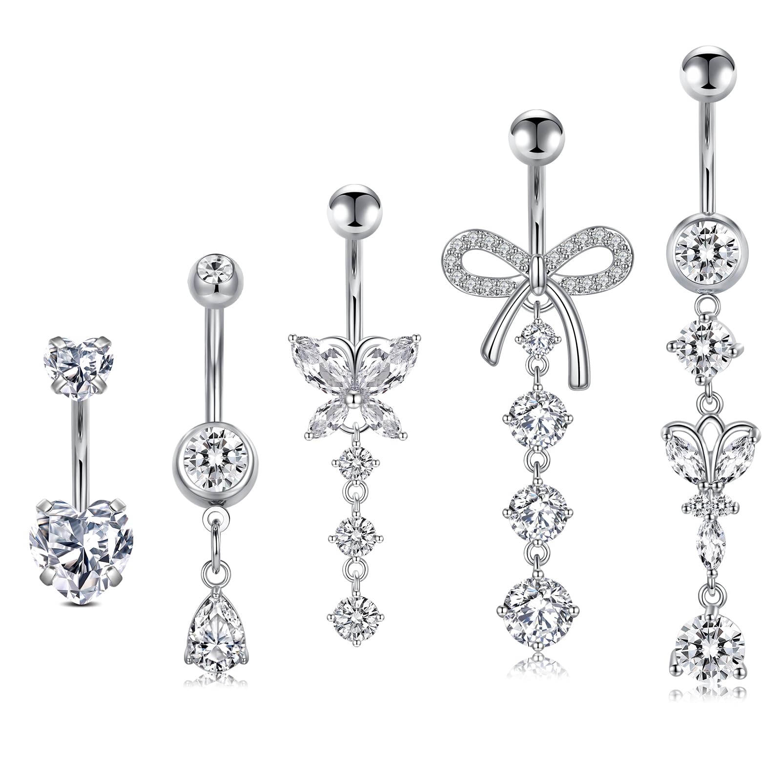 【5 DELICATE ASSORTED DESIGNS】 This versatile collection comes with 5 unique pieces tailored for your navel piercing: a classic sparkling heart, an elegant teardrop, an intricate layered dangle, a charming bow with a stone chain, and a beautiful butterfly drop.
