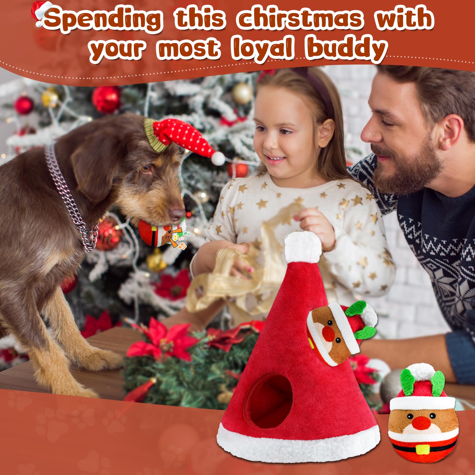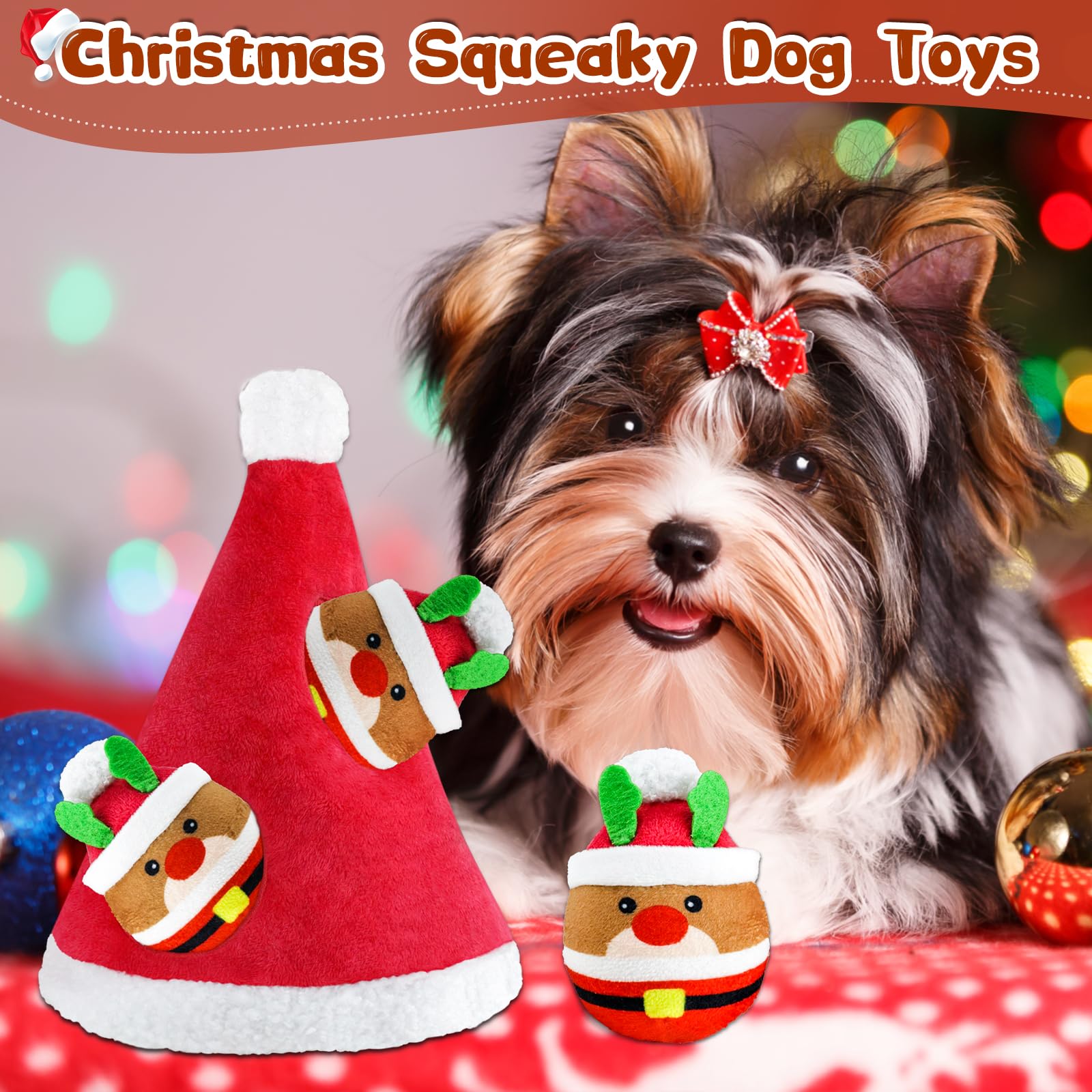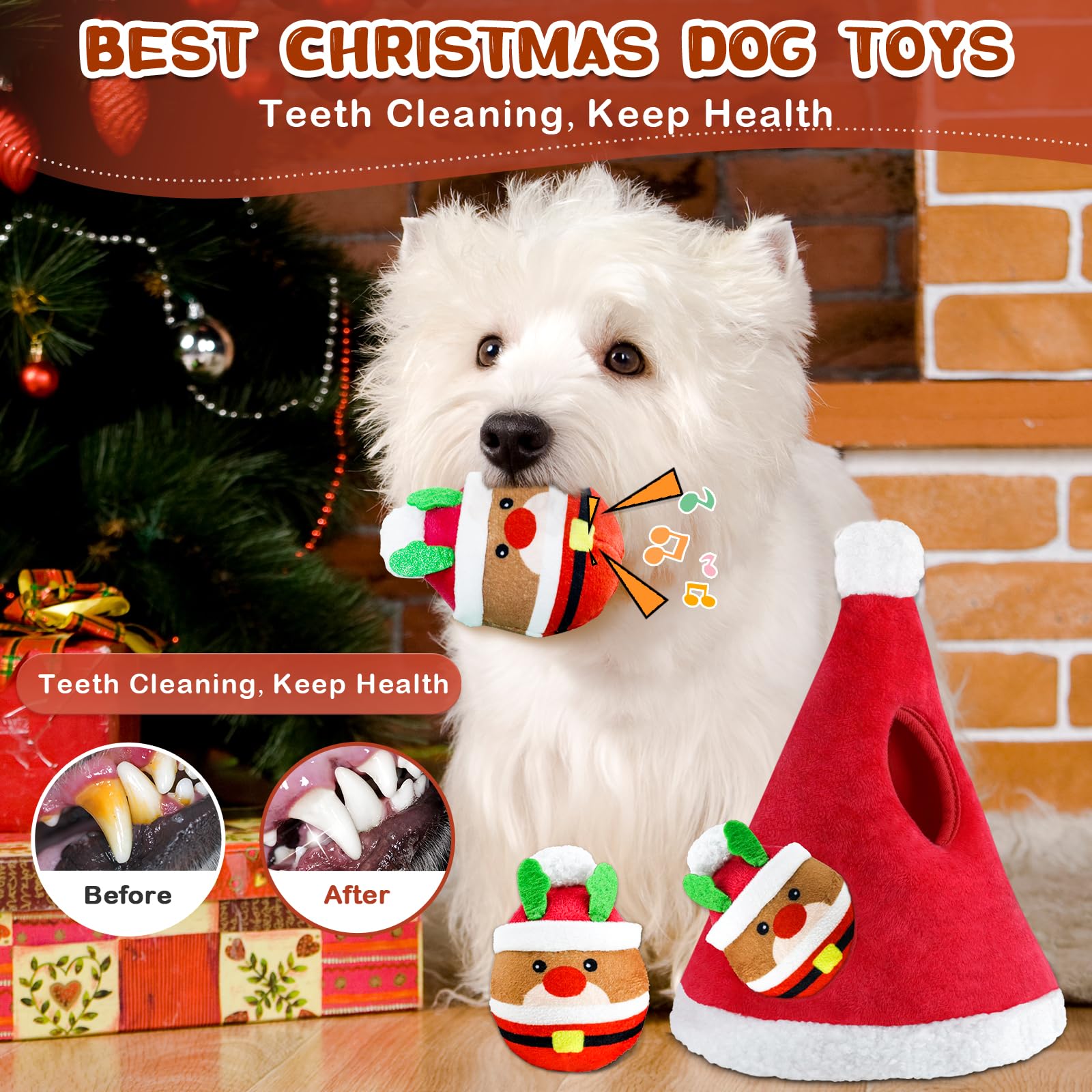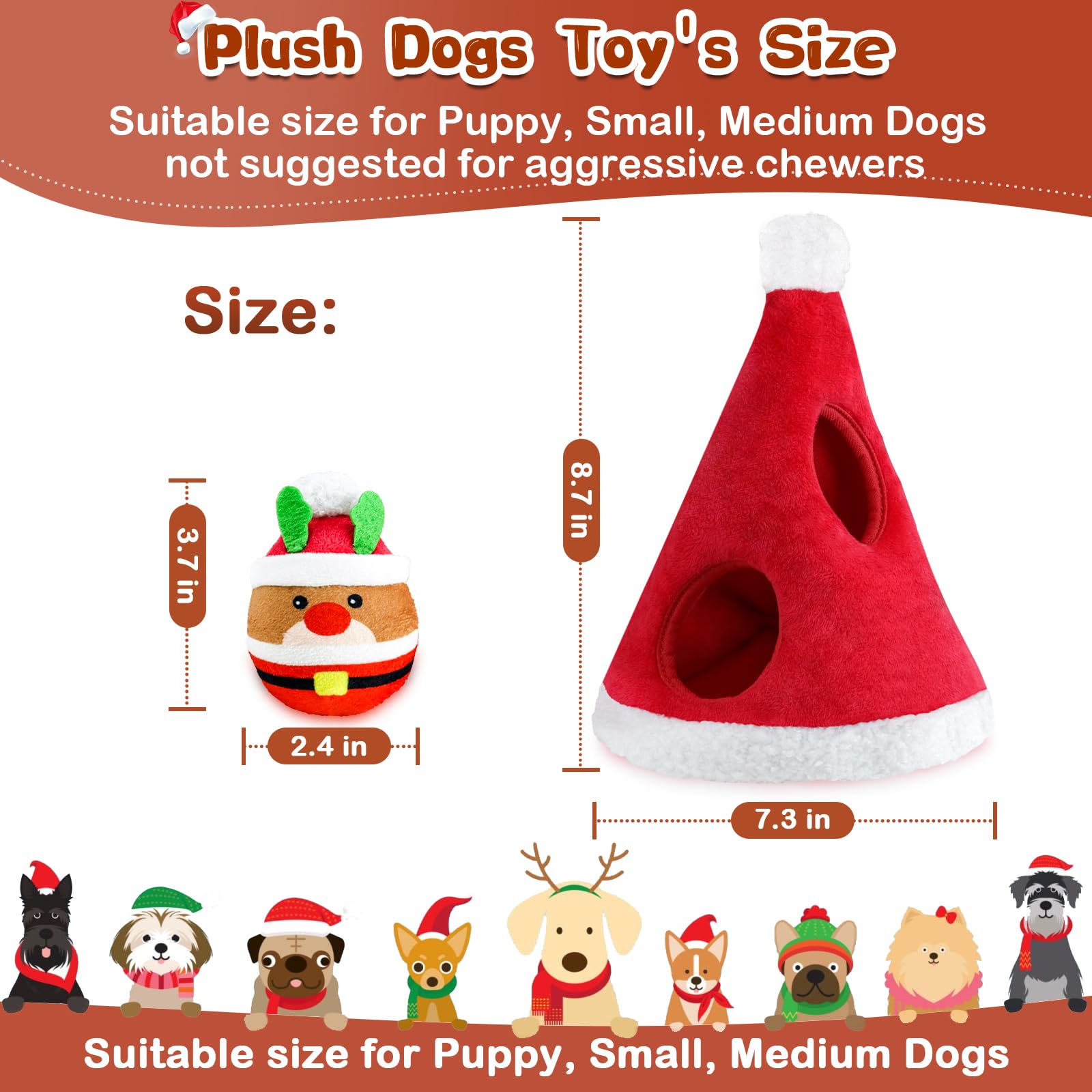 CHRISTMAS DOG TOYS : The Christmas hide and seek dog toys Come with 3 Christmas Elk decoration set and 1 Christmas hat toy. Colorful, soft and well-made cute toys are a great Xmas and New Year gift for small and medium dogs. 3 holes on the chimney for hiding these 3 small Christmas elk decoration which each of them has a built-in squeaker to increase interaction with your dogs