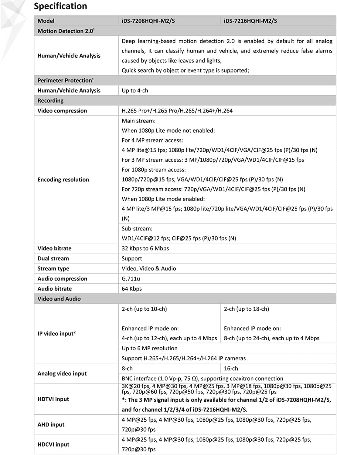 Video compression: H.265 Pro+/H.265Pro/H.265/H.264+/H.264 Encoding resolution Main stream: When 1080p Lite mode not enabled: For 4 MP stream access: 4 MP lite@15 fps; 1080p lite/720p/WD1/4CIF/VGA/CIF@25 fps (P)/30 fps (N) For 3 MP stream access: 3MP/1080p/720p/VGA/WD1/4CIF/CIF@15 fps For 1080p stream access: 1080p/720p@15 fps; VGA/WD1/4CIF/CIF@25 fps (P)/30 fps (N) For 720p stream access: 720p/VGA/WD1/4CIF/CIF@25 fps (P)/30 fps (N) When 1080p Lite mode enabled: 4 MP lite/3 MP@15 fps; 1080p lite/720p lite/VGA/WD1/4CIF/CIF@25 fps (P)/30 fps (N) Sub-stream: WD1/4CIF@12 fps; CIF@25 fps (P)/30 fps (N) Video bitrate: 32 Kbps to 6 Mbps IP video input: 2-ch (up to 18-ch) Enhanced IP mode on: 8-ch (up to 24-ch), each up to 4 Mbps.Up to 6 MP resolution. Support H.265+/H.265/H.264+/H.264 IP cameras Analog video input: 16-ch HDTVI input: 3K@20 fps, 4 MP@30 fps, 4 MP@25 fps, 3 MP@18 fps, 1080p@30 fps, 1080p@25 fps, 720p@60 fps, 720p@50 fps, 720p@30 fps, 720p@25 fps *: The 3 MP signal input is only available for channel 1/2 of iDS-7208HQHI-M2/S, and for channel 1/2/3/4 of iDS-7216HQHI-M2/S. AHD input: 4 MP@25 fps, 4 MP@30 fps, 1080p@25 fps, 1080p@30 fps, 720p@25 fps, 720p@30 fps HDCVI input: 4 MP@25 fps, 4 MP@30 fps, 1080p@25 fps, 1080p@30 fps, 720p@25 fps, 720p@30 fps HDMI output: 1-ch, 1920 × 1080/60 Hz, 1280 × 1024/60 Hz, 1280 × 720/60 Hz, 1024 × 768/60 Hz VGA output: 1-ch, 1920 × 1080/60 Hz, 1280 × 1024/60 Hz, 1280 × 720/60 Hz, 1024 × 768/60 Hz SATA: 2 SATA interfaces, up to 10 TB capacity for each disk USB interface: Front panel: 1 × USB 2.0; Rear panel: 1 × USB 2.0 Front panel: 1 × USB 2.0; Rear panel: 1 × USB 3.0 Alarm in/out:N/A (optional to support ) Power supply:12 VDC, 3.3 A