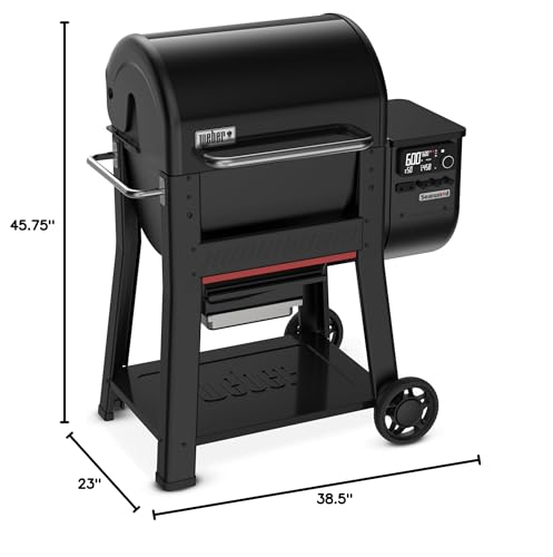 Smoke, sear, roast, and more on the Searwood 600 pellet grill featuring a full temperature range from 180° to 600°F and DirectFlame cooking that creates bold flavorful sear marks and delicious golden browning. This grill heats up in 15 minutes or less*, cooks evenly, and features a full grate sear zone. Cook confidently with intuitive digital controls and Wi-Fi and Bluetooth connectivity that lets you monitor and control the smoker grill remotely, see live graphs of your cook, get readiness alerts, recipes, and more from the WEBER CONNECT app on your smart phone. The WEBER CONNECT digital LCD controller is simple and intuitive to navigate with a backlit knob and large, lighted display. Steel front and side tables (sold separately) add workspace to prep or pull food from the smoker. Large cooking capacity lets you cook on two levels at the same time. The deep 9.5"" top rack easily fits a brisket and can be removed to create a 11.5"" tall space that accommodates larger foods like roasts and poultry. Smoker's side hopper location makes it easy to load pellets and is sized perfectly to fit a standard 20-pound bag of pellets. The hopper is also equipped with a pellet release handle that makes it easy to change pellet flavors. Experience smooth, continuous pellet flow for up to 20 hours of worry-free remote outdoor cooking. Then, clean up quickly and easily with the pull and clean Grease and Ash Management system located at the front of the grill. The Searwood 600 Wood Pellet Smoker Grill also features a porcelain-enameled lid that's highly durable and won't rust or peel. The grill's ergonomic design includes large, durable wheels and a built-in handle, making it simple to move across uneven ground and patio pavement. The easy-access maintenance panel is straightforward to troubleshoot, if necessary. *Based on lab conditions of 77°F ambient temperature with premium hardwood pellet fuel