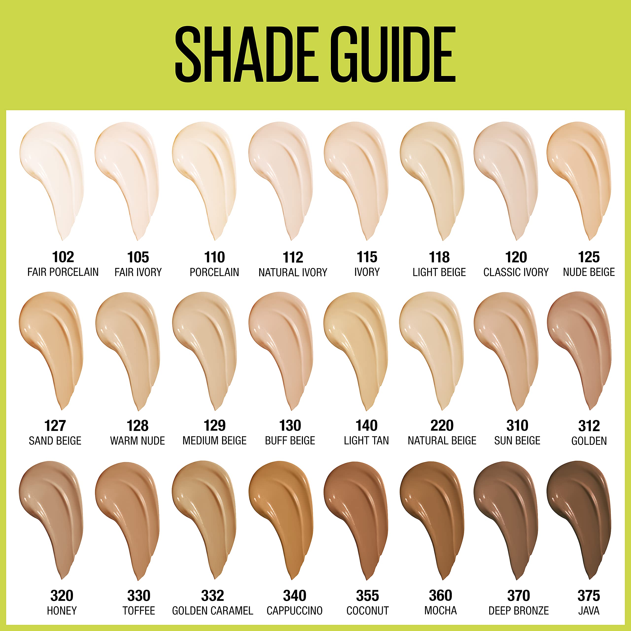 Be your own professional makeup artist with Maybelline's full coverage 24H foundation. Saturated color pigments provide an ultra-transforming effect in this long-lasting foundation. The lightweight, yet high-impact coverage formula glides onto the skin for a flawless finish that lasts all day. Oil free. Doesn't clog pores. Dermatologist tested.