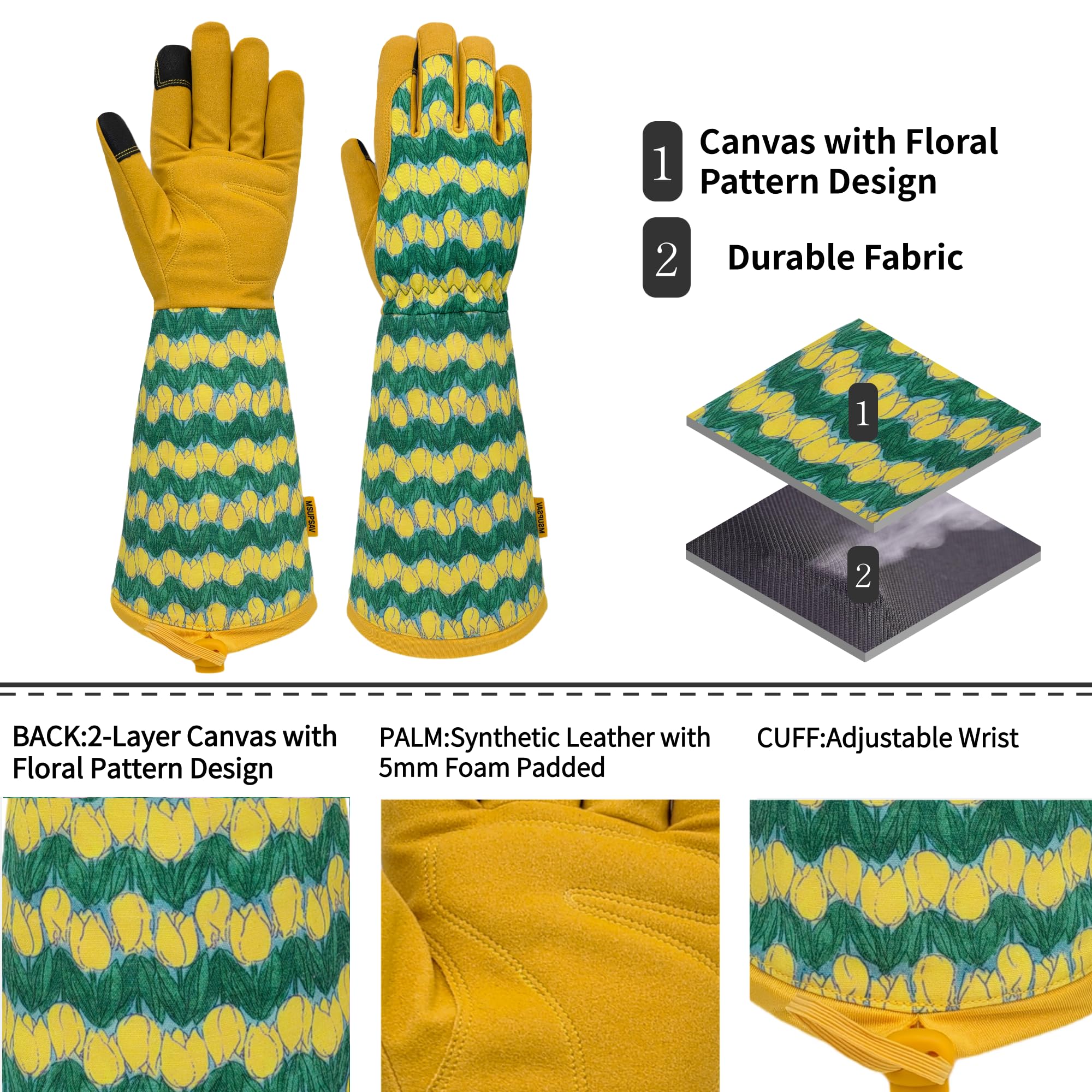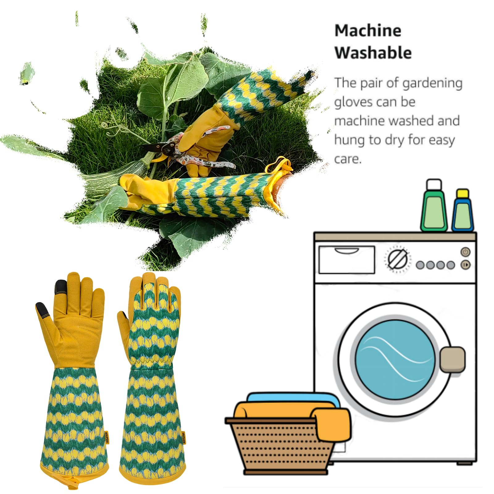 〖Multi-purpose Gardening Gloves〗Full Protection Rose Pruning Gloves-synthetic leather&canvas gardening gloves for women with bright floral pattern.long cuff pruning gloves provide arm protection against scratches from dry branches and keep dirt and bugs out.There are carefully double thread sewn.The garden gloves are not completely cactus resistant ,please be careful not to get hurt when you using them.Support machine washable.