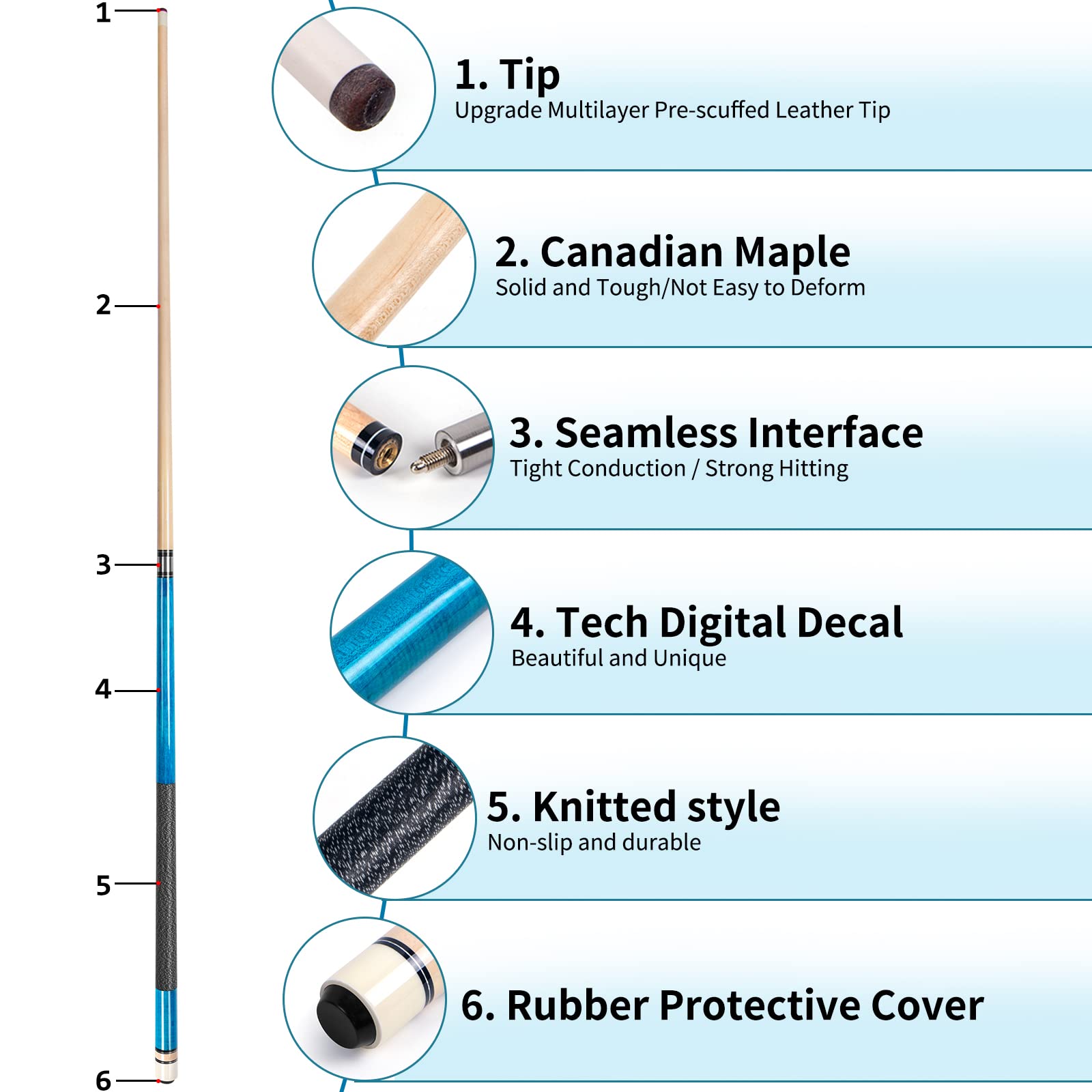 Canadian Maple Wood:Firm and durable, we have chosen the best quality for the pool stick and the pool cue tips durability. Each pool cue case contains 4 unique pool cues sticks