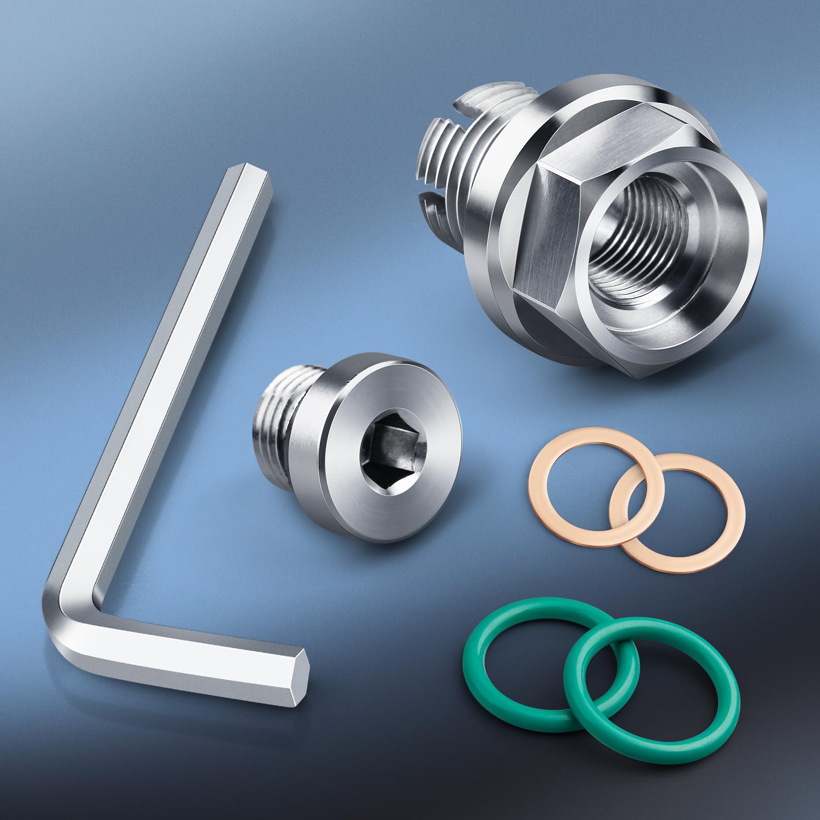 Package Include: 1pcs stainless steel self tapping piggyback oversize oil drain plug, specification: M12.1-1.25 x 15mm; 1pcs L Shape Hex Key Allen Wrench (for the piggyback drain plug); 2pcs fluorine o-ring for main plug; 2pcs red copper gasekt for piggyback drain plug.