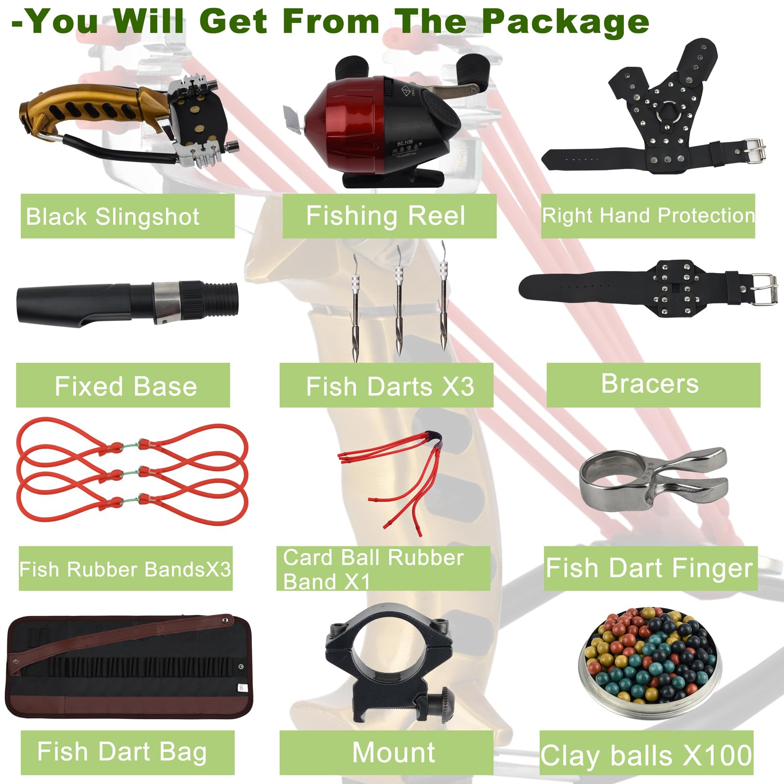 √What’s in the package: 1 x professional slingshot(Black or gold is for your choice.). 1 x fishing reel. 1 x fishing reel base. 1 x clip. 3 x slingshot rubber bands. 1 x 3-strand rubber tube. 1 x wrist strap. 3 x fishing arrows. 1 x fish dart releaser. 1 x fish dart bag (holds 35 fishing arrows). 1 x screw key. 1 x hand guard (We have two types suitable for left-hander or right-hander).