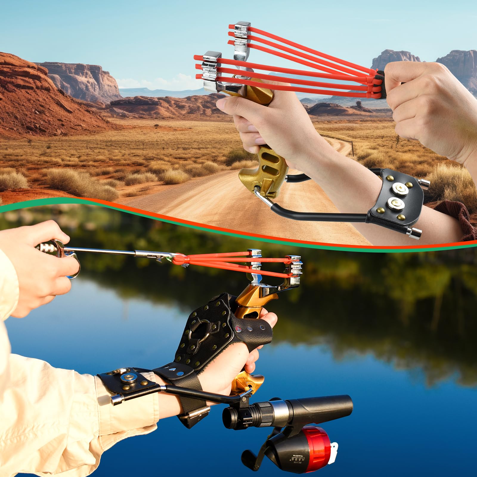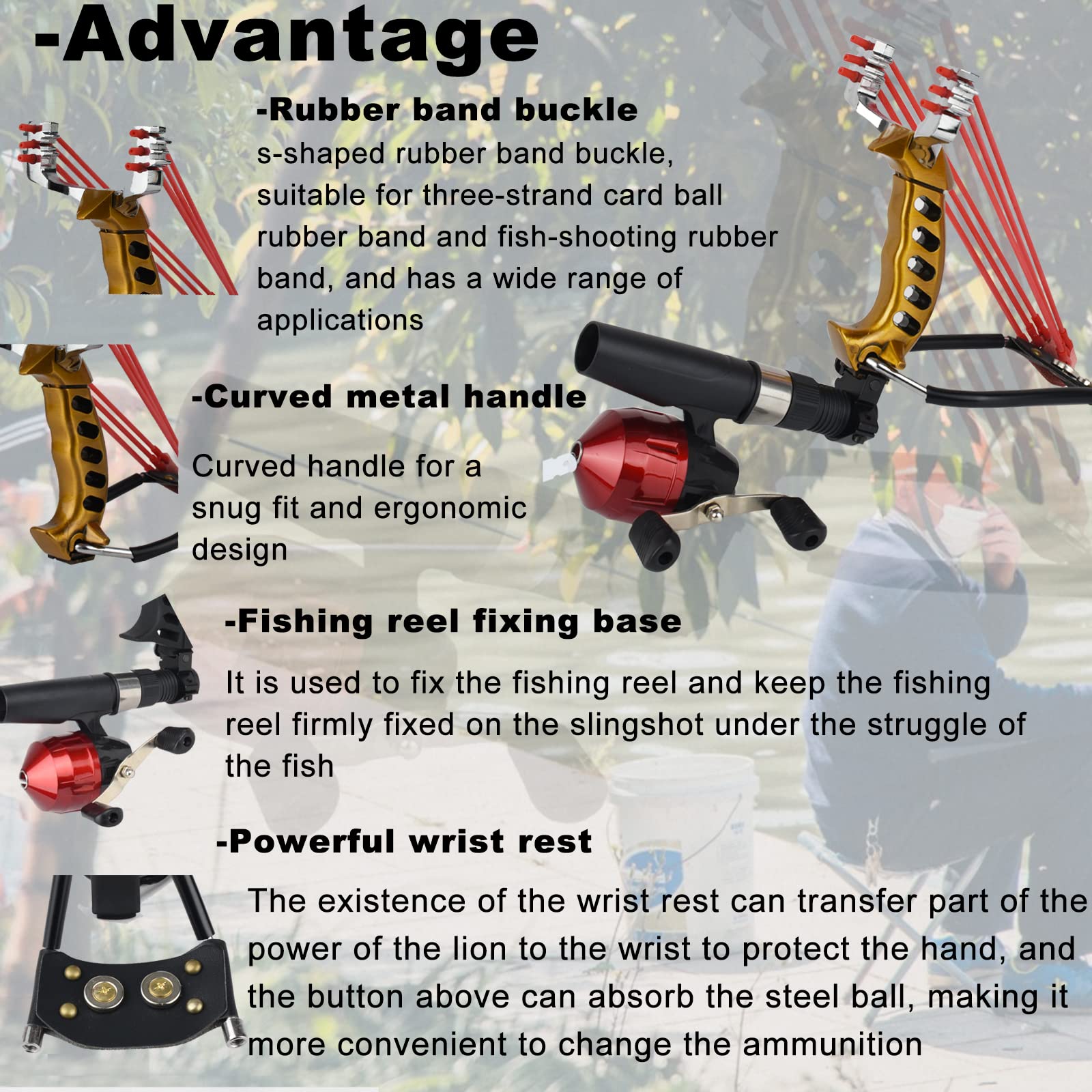 √This slingshot has two gameplay options. Install the fishing reel and it will be an excellent fishing slingshot. We also offer three fish darts as a gift, so you can go to the river to shoot fish. When you remove the fishing reel, it will turn into a powerful hunting slingshot again. You can put on the hunting Slingshot rubber band we come with, pick up mud balls, steel balls, and small stones to shoot. Very powerful, please pay attention to safety.