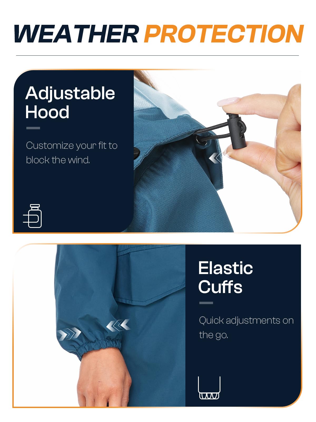 【Shape Your Style】: Elastic-bound cuffs, drawcord adjustable hood, adjustable feature let you tailor the fit you want. And 2 snap hand pockets hold your essentials safe.