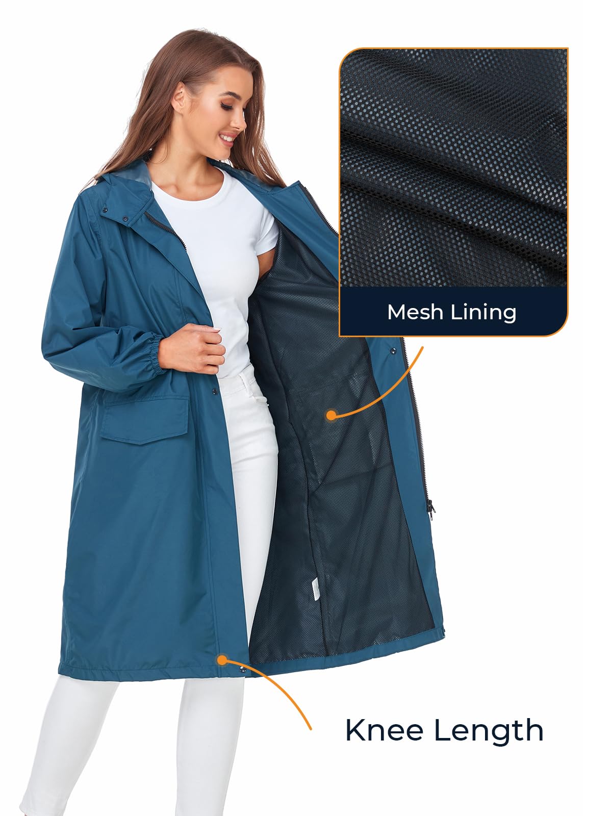 【Stay Dry】: Blocks moisture by 2.5L waterproof fabric with DWR finish. Mesh lining improves airflow, minimizes skin contact with coat, help sweat releasing. SaphiRose rain jacket lets you be active on rainy days.