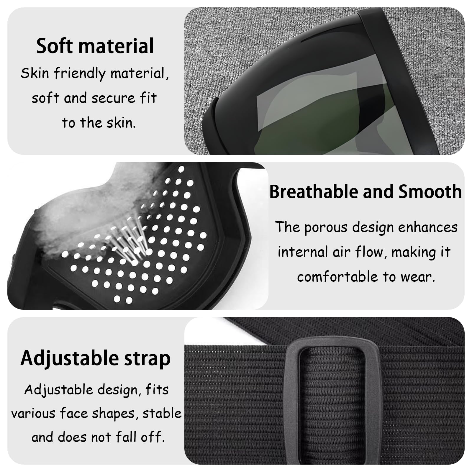 2.[Carefully designed]:This dust mask is designed to be compact and lightweight, with almost no heaviness when worn, making it suitable for long-term work or outdoor activities. The head mounted design combined with adjustable polyester fiber straps not only ensures the stability of the protective goggles, but also allows for adjustment according to one's head circumference and comfort, achieving a convenient and comfortable wearing experience. Both men and women can easily wear it.