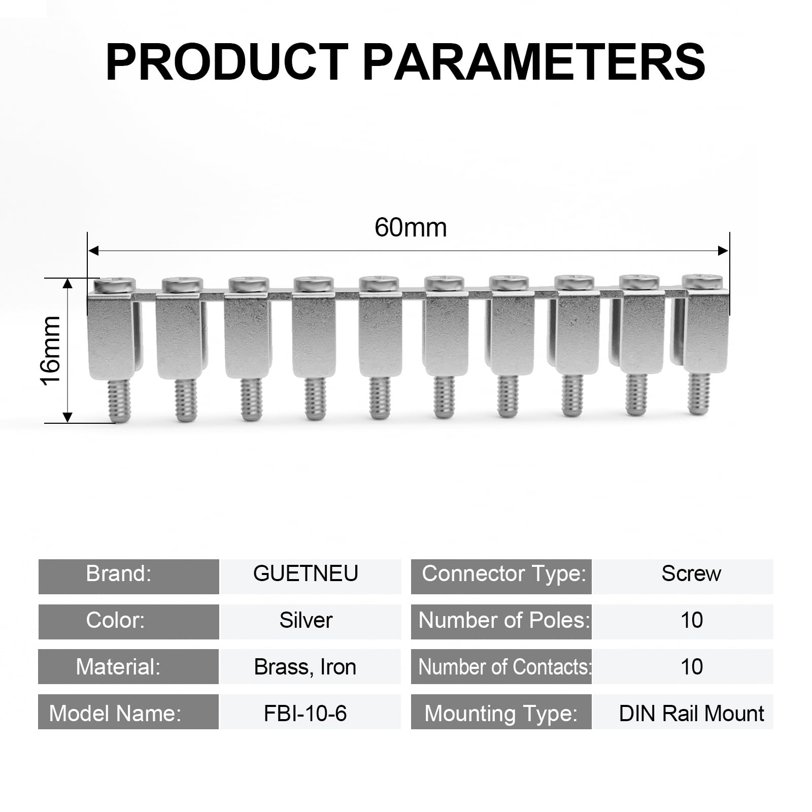 Product Parameters: Color: Silver Material: Brass, Iron Model Name: FBI-10-6 Connector Type: Screw Number of Poles: 10 Number of Contacts: 10 Mounting Type: DIN Rail Mount