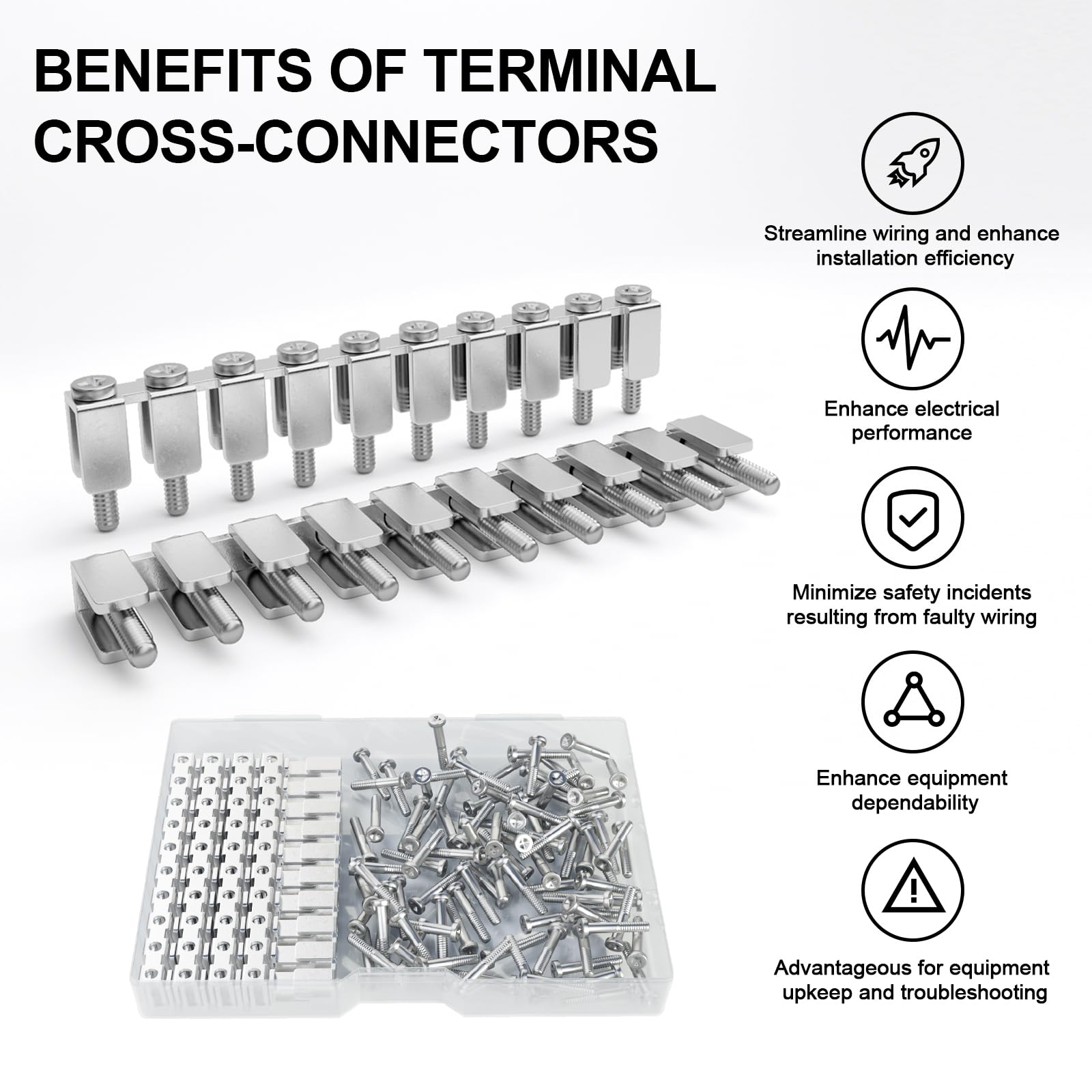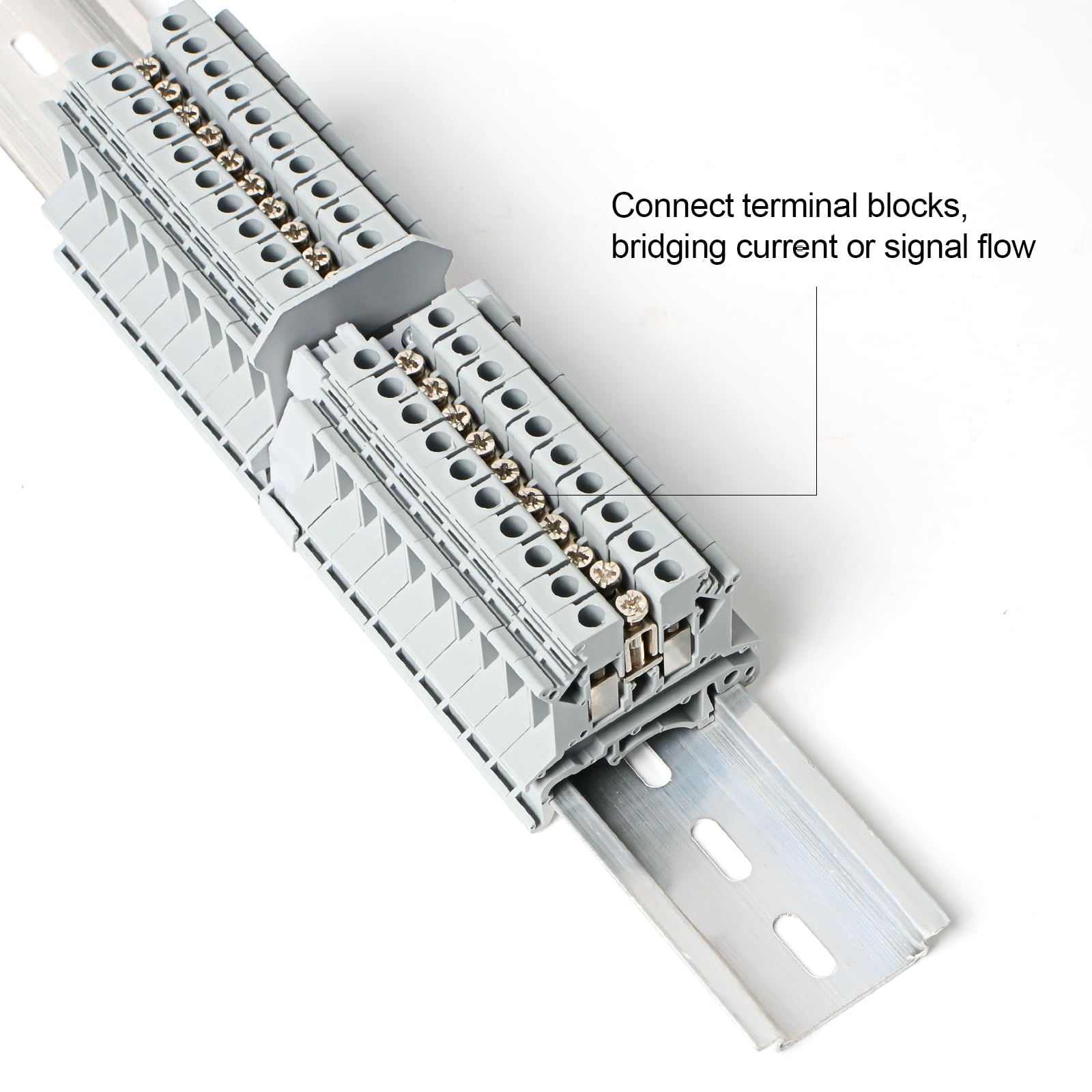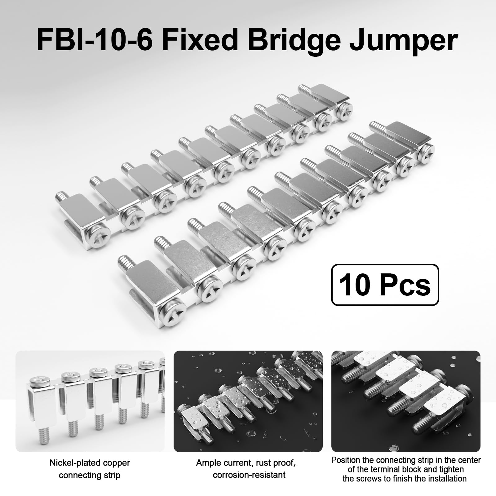 GUETNEU 10 Pcs Fixed Bridge Jumper, FBI-10-6 Fixed Bridge Connectors for DIN Rail Terminal Blocks, Insert-Pull Bridging, Compatible with UK2.5B and UK5N, 10 Pole, 100 Screws Included The GUETNEU FBI-10-6 Fixed Bridge Jumper provides an efficient solution for electrical bridging between terminal blocks. This pack includes 10 premium connectors designed for reliable and seamless connectivity. High-Quality Material Made from high-grade brass, these jumpers offer excellent electrical conductivity, corrosion resistance, and thermal conductivity. The robust brass construction ensures efficient current transmission with minimal energy loss, while its strong mechanical properties maintain stable connections even with frequent use. The design also helps in cooling during high current flow, reducing heat buildup and extending lifespan. Functionality These bridge jumpers connect circuits or wires on terminal blocks, enabling smooth current flow between them. This bridging function supports efficient transmission of current or signals across your electrical system. High-Quality Conductive Sheet Featuring pure copper conductive plates, these connectors guarantee superior contact performance and minimal resistance. Their standard dimensions ensure reliable use. Widely Used Ideal for electrical and electronic applications, these fixed bridge jumpers are perfect for circuit debugging, wiring, power distribution, and equipment maintenance. They offer stability, reliability, and convenience for various electrical connections. Product Parameters Color: Silver Material: Brass, Iron Model Name: FBI-10-6 Connector Type: Screw Number of Poles: 10 Number of Contacts: 10 Mounting Type: DIN Rail Mount The GUETNEU FBI-10-6 Fixed Bridge Jumper ensures dependable and efficient bridging for your electrical systems. Ideal for both professional and DIY use, these jumpers provide reliable connections and superior performance.