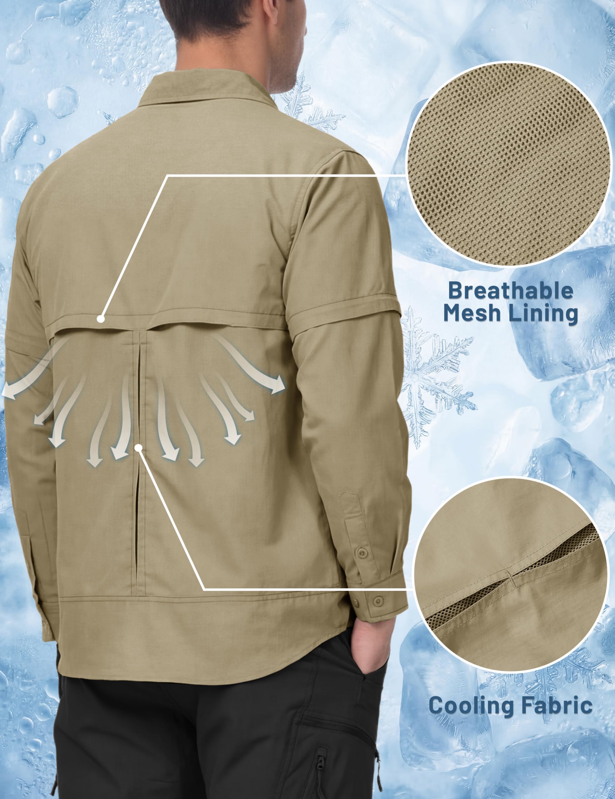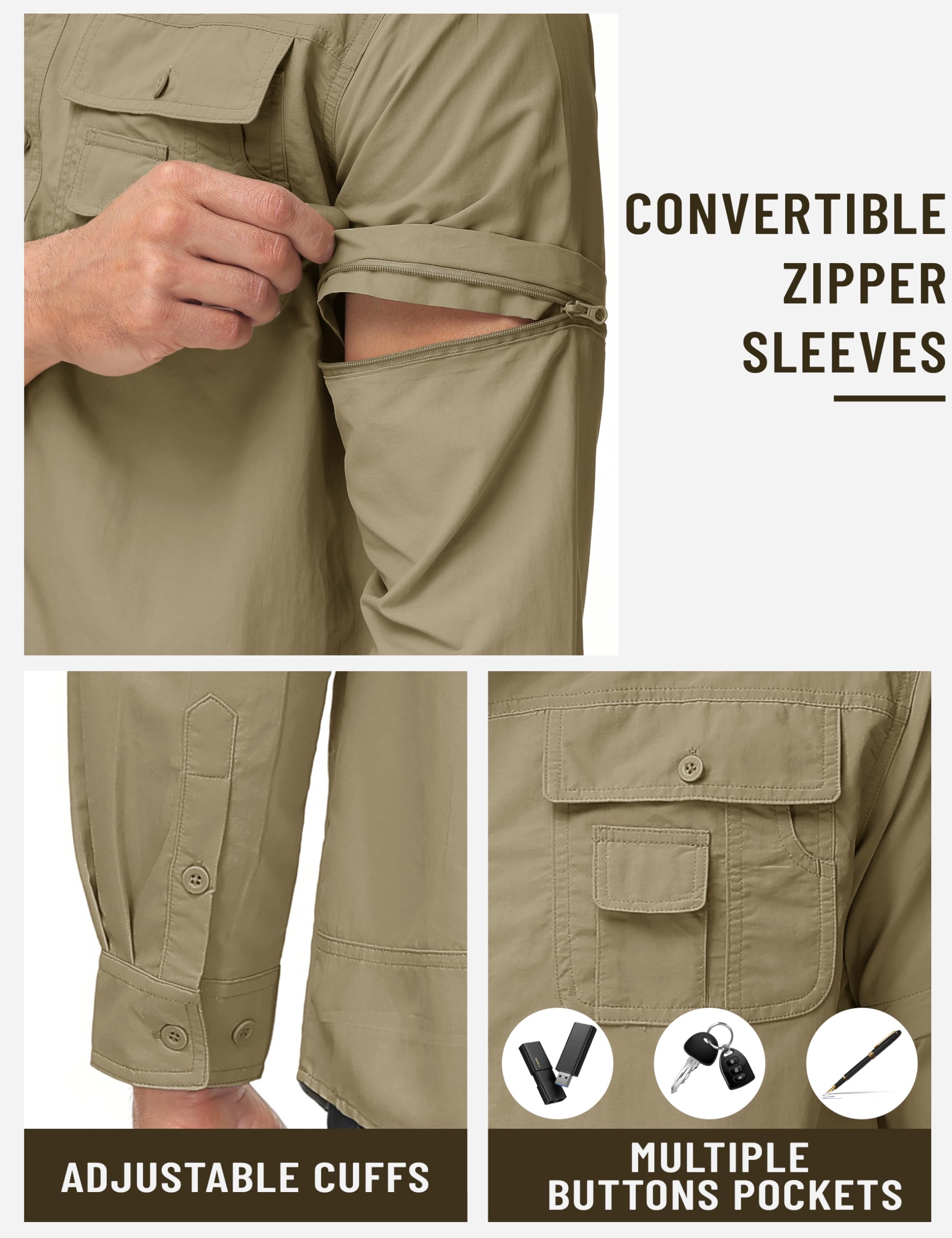 Convertible Zipper Sleeve Shirt&Function Pocket Design:This hiking shirt for men is equipped with multiple practical pockets,offering ample storage.The long sleeve shirts ferturing with zippers can convert long sleeves to short sleeves for hot days.