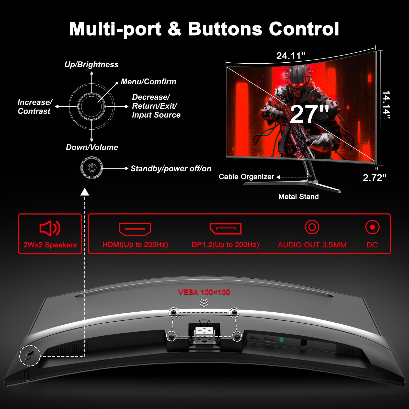 Ports: DP 1.2 (up to 200Hz)&HDMI(up to 200Hz), 2x2W speakers built-in, audio jack(1 HDMI cable included). Plug & Play: continuously and automatically detect and switch input signals