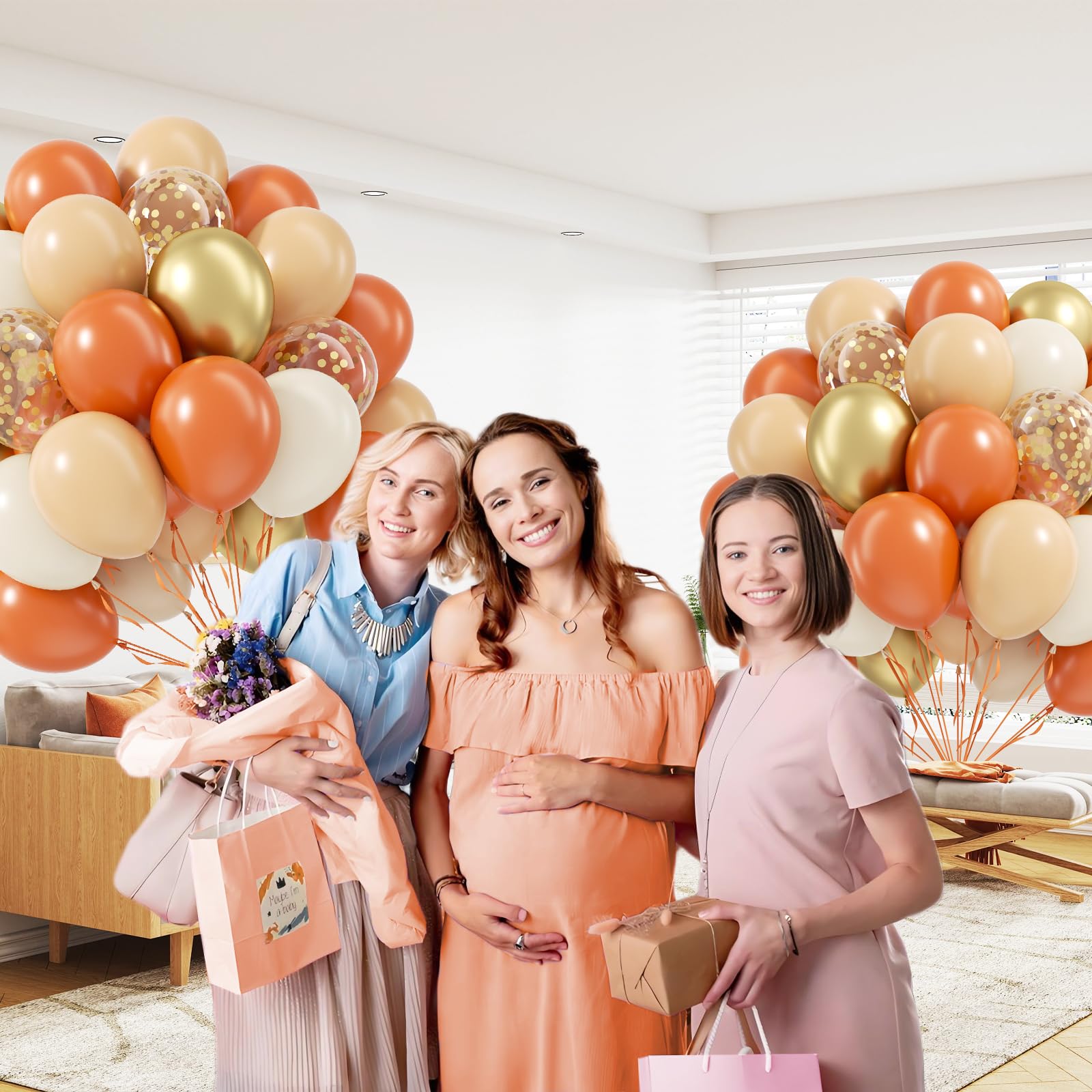 Package Include: The fall balloons include 12inch burnt orange balloonsx25, 12inch nude balloonsx15, 12inch white balloonsx10, 10inch metallic gold balloonsx5, 12inch gold confetti balloonsx5, glue dotsx20, orange ribbonx1