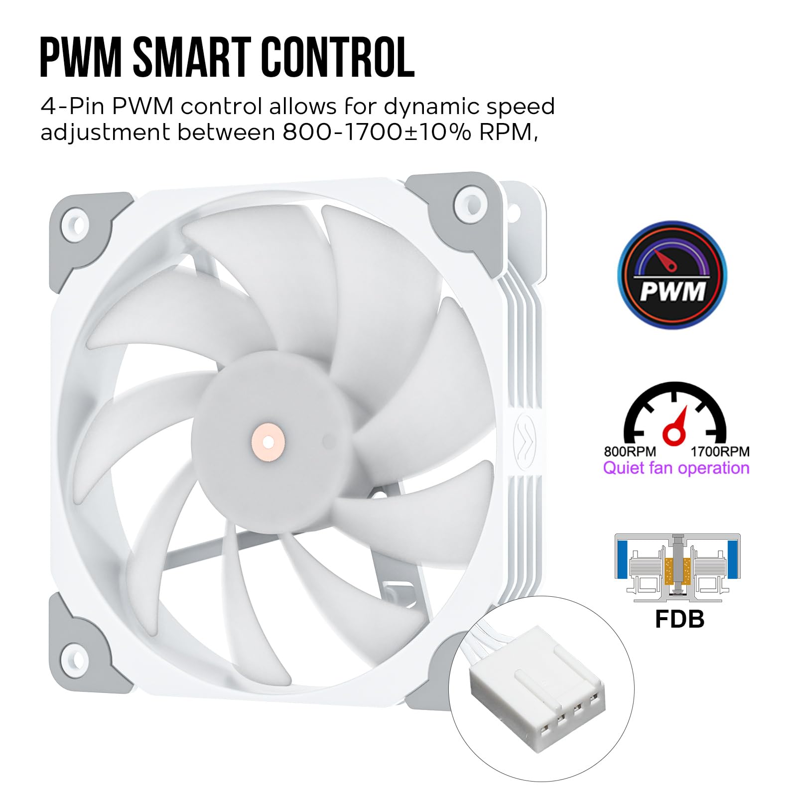 PWM Smart Control: 4-Pin PWM cable allows for dynamic speed adjustment between 800-1700 RPM, min noise or max airflow