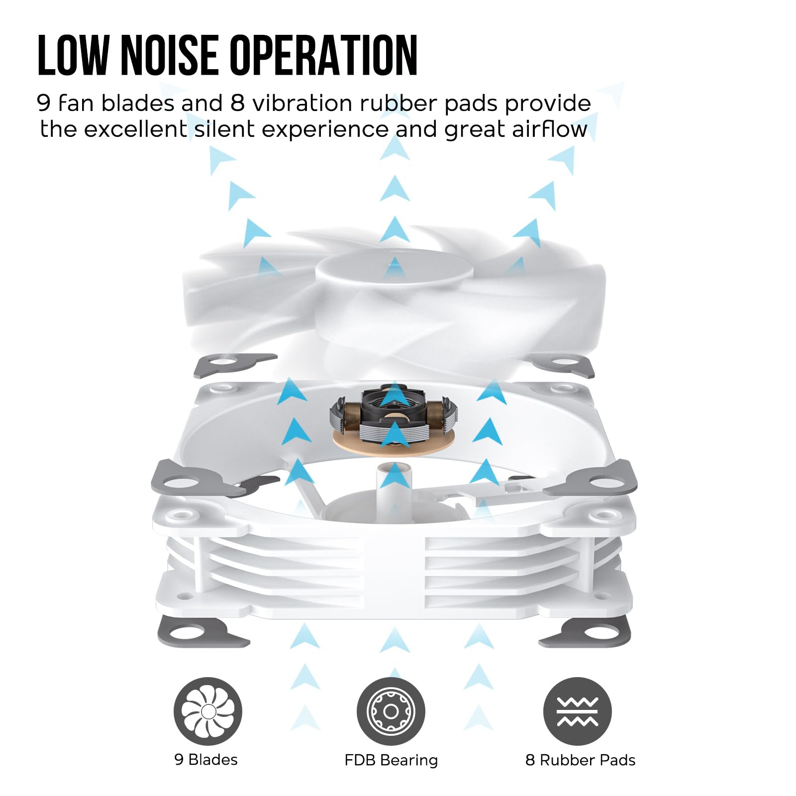 Low Noise Operation: Nine fan blades and eight vibration rubber pads provide the better silent experience and great airflow for the case and components