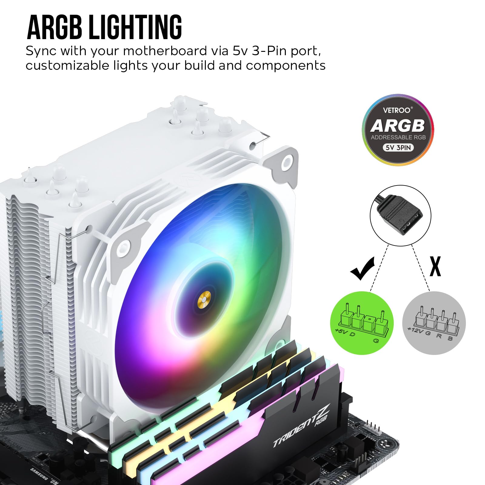 ARGB Lighting Sync: The RGB of cooler can sync with motherboard via 5V 3-Pin port, customize lights your builds and components