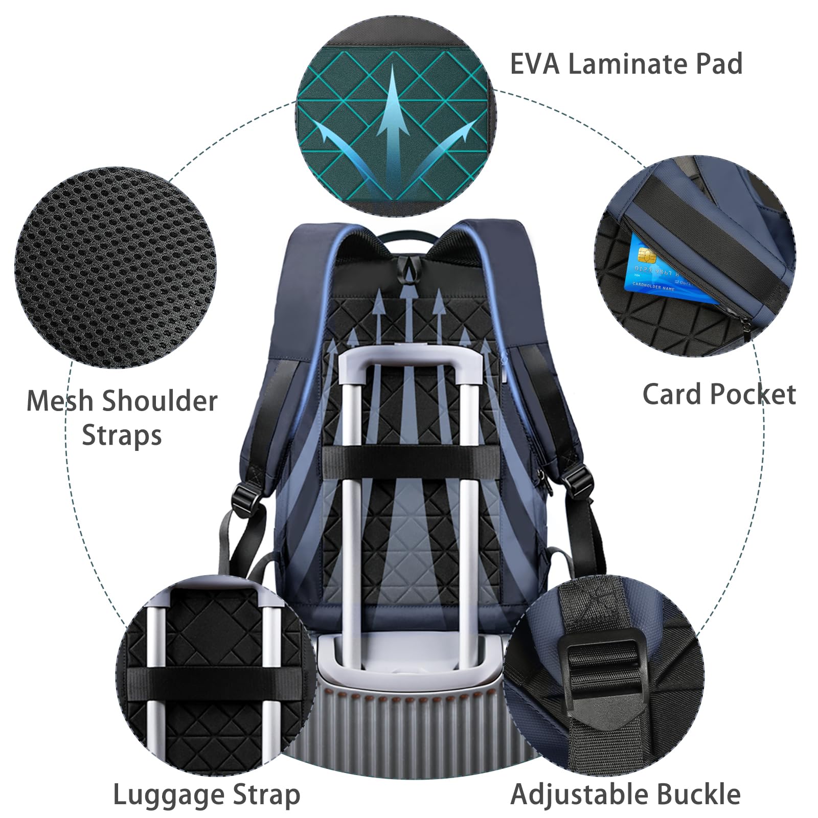 【Comfortable & Durable】This blue laptop backpacks for men is made of waterproof sturdy Oxford cloth with durable metal zippers. The back side is built with high quality EVA material, which is comfortable and soft, gives you maximum back support. Breathable and adjustable shoulder straps with foam pad help relieve the stress of shoulder.