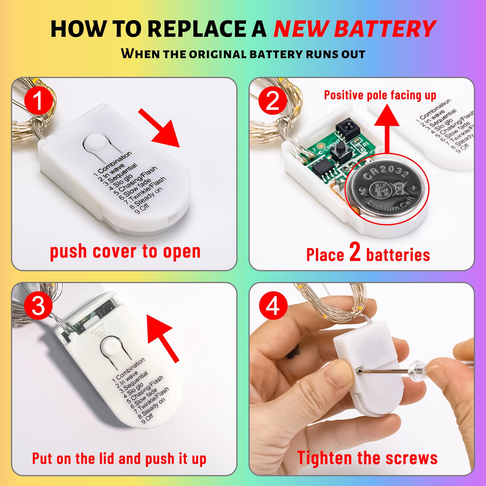 Light Up Longer and Energy-Saving: Powered by 2 CR2032 batteries(included) and also come with the extra 6pcs batteries for replacement; The batteries need to be replaced when the lights get dim. Low voltage, won't overheat even with a long time of use. And the installation is also very simple and only takes a few seconds