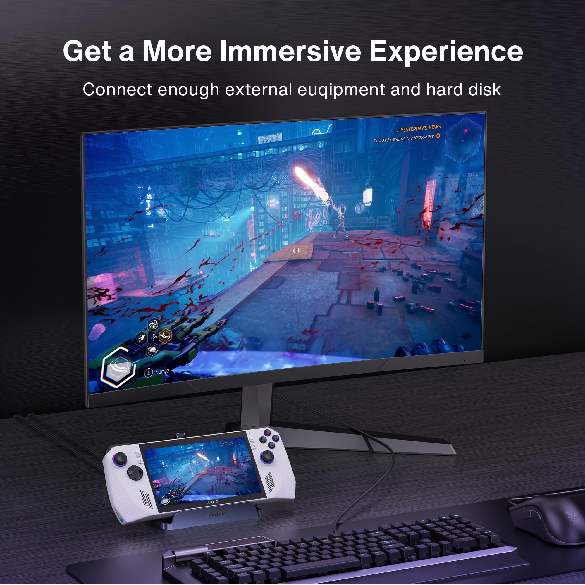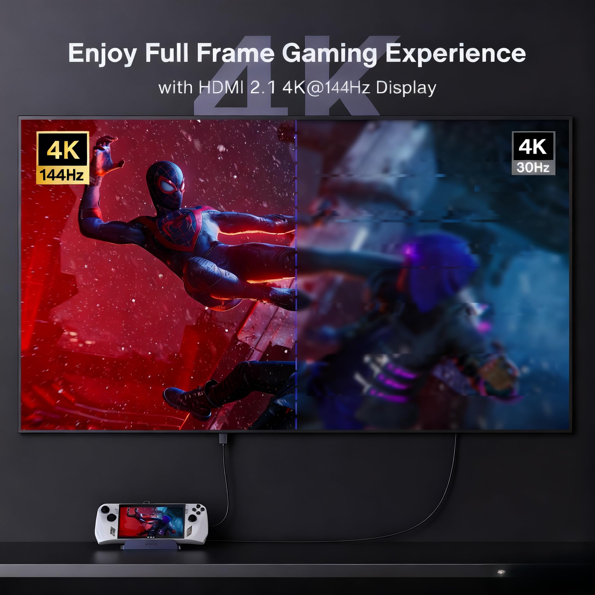 【Multiport Battlestation】An 8-in-1 hub featuring a 4K@144Hz HDMI port, 1Gbps Ethernet, three 5Gbps USB-A ports, and a fast-charge USB-C port. Includes joystick caps to protect controls from wear.