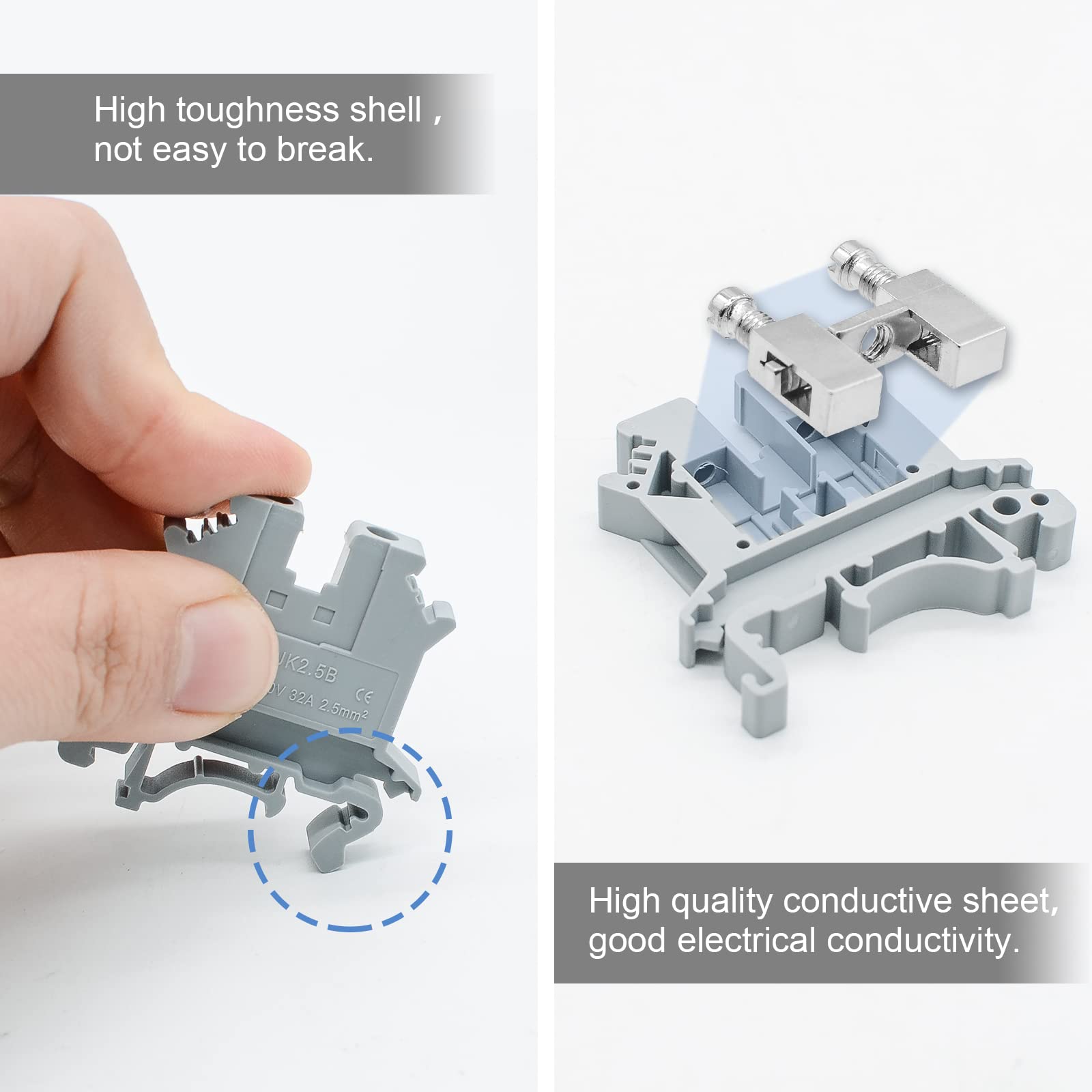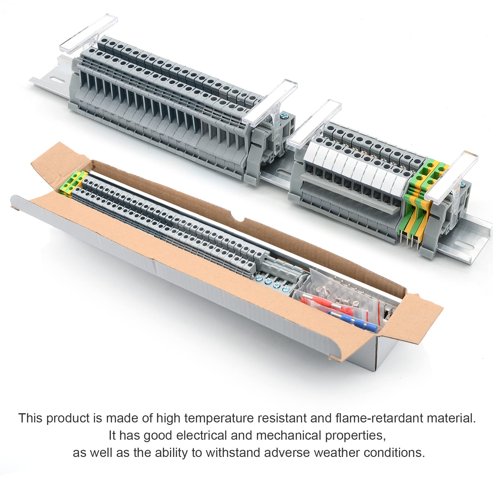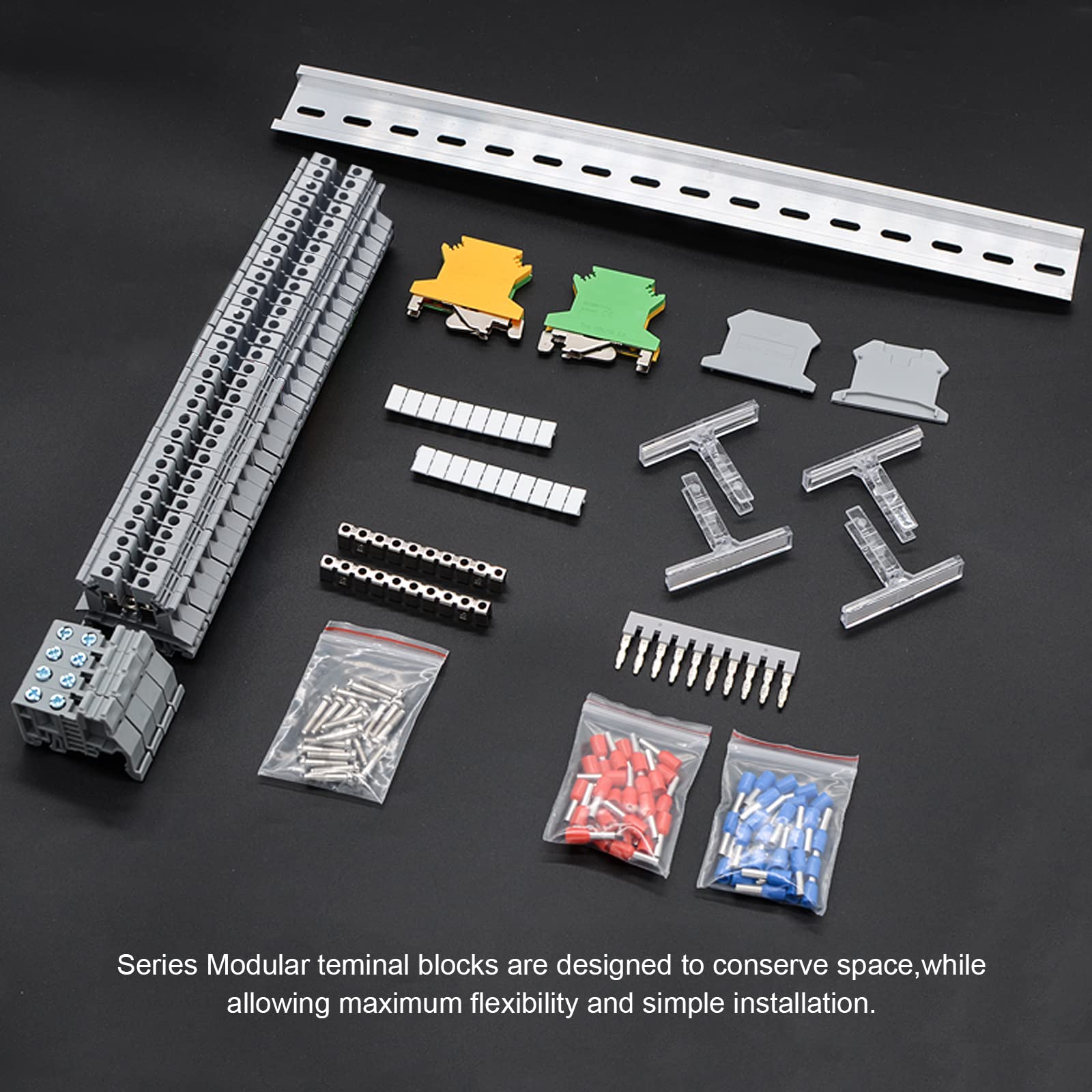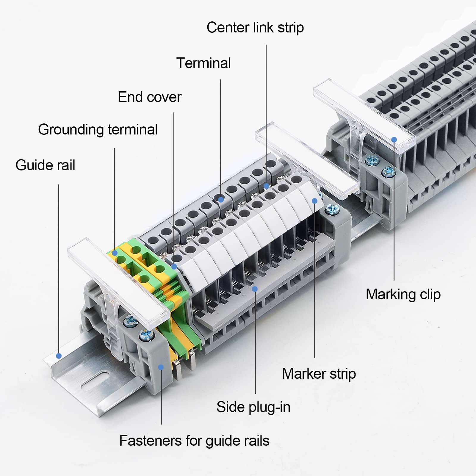 Product suite group:Including 1 guide rail, 2 center link strips, 1 side plug-in, 2 marker strips, 2 grounding terminals, 2 baffles, 4 marking clips, 4 universal fasteners for guide rails, 30 gray terminal blocks, and 16 needle tube terminal lugs in red and blue, a total of 32 pieces