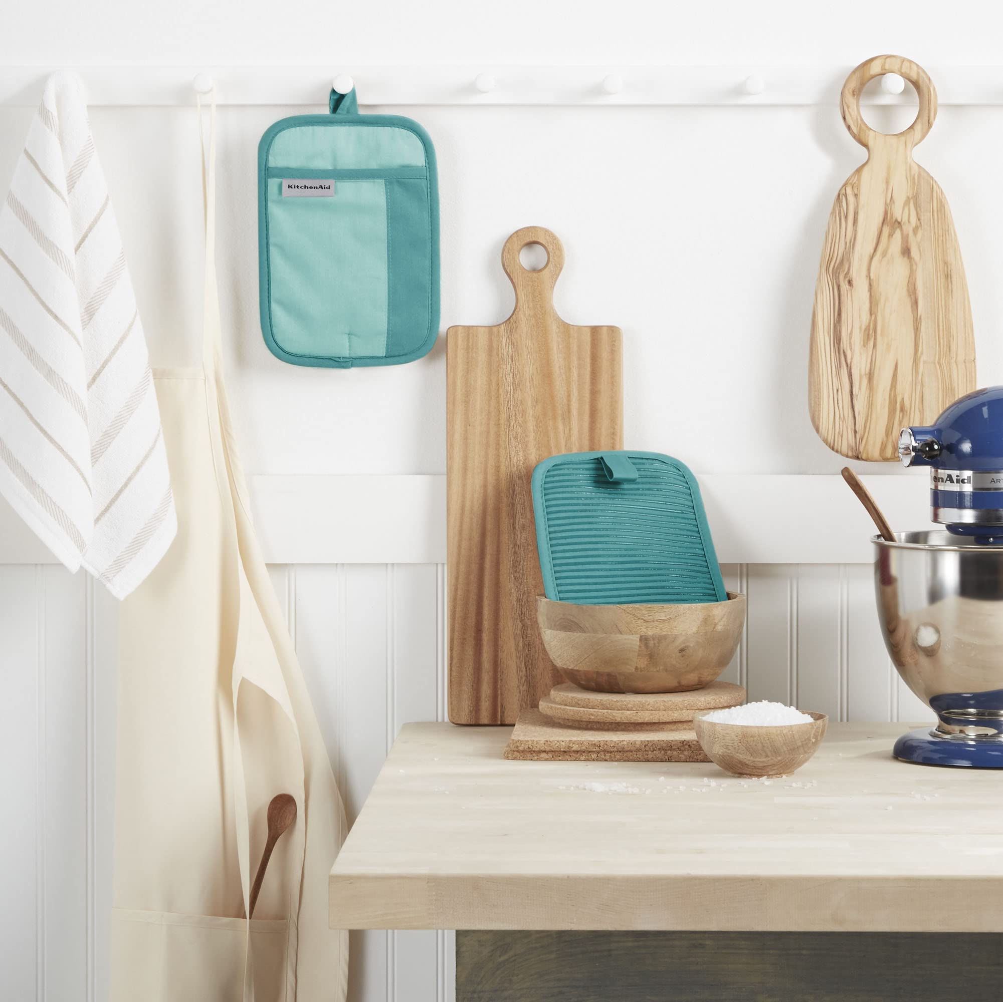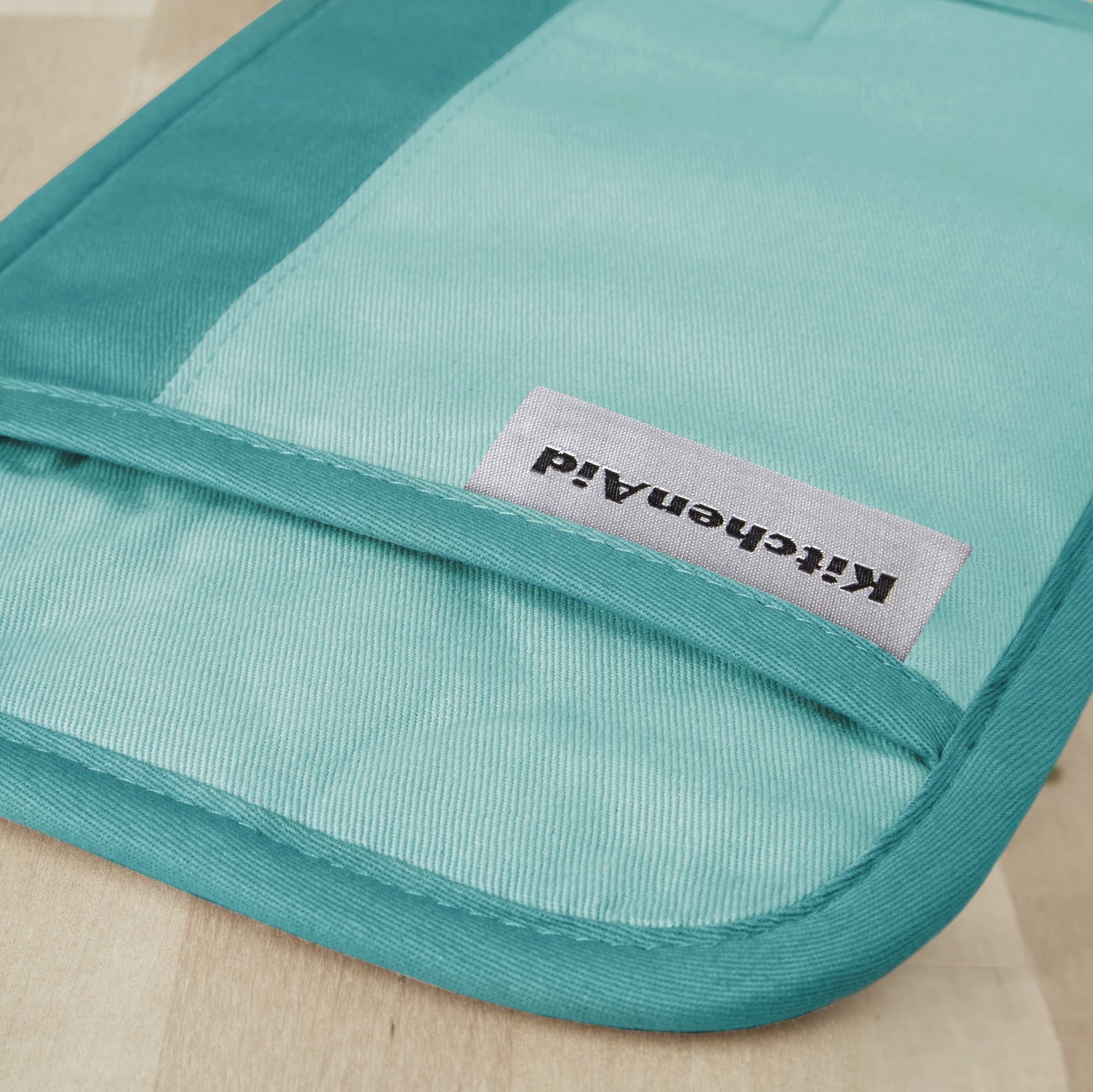 Shield your hands from the heat and burns with the KitchenAid Beacon 2-Piece Pot Holder Set. Made of heavy-duty cotton with polyester lining that offers comfort and insulation. This set includes two pot holders measuring 7” wide by 10” inches long. They are heat resistant with clear printed silicone to ensure a firm and secure grip on hold handles. Each feature a convenient hanging loop for display or easy storage.
